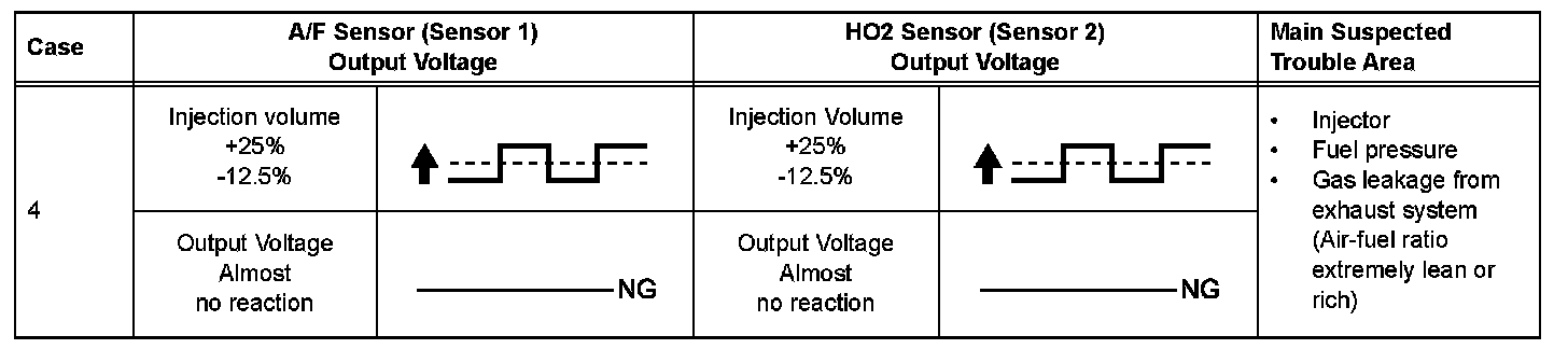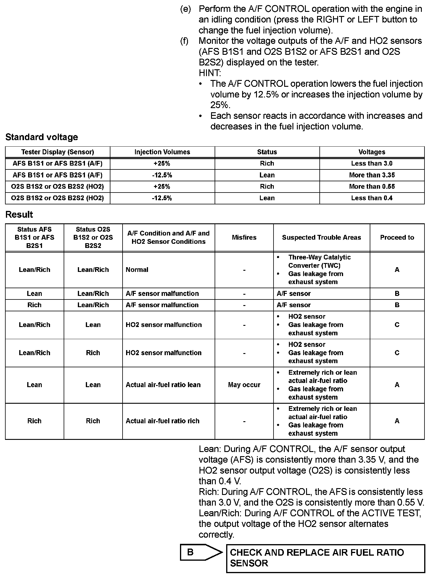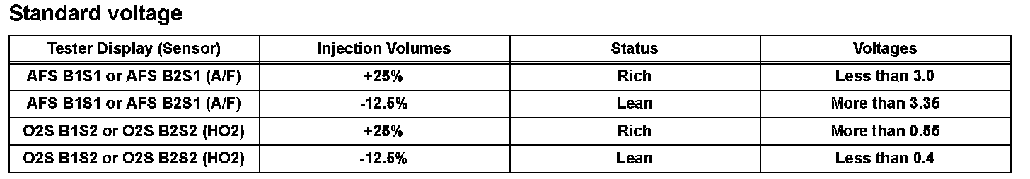 - If the voltage outputs of both the sensors remain lean or rich, the air-fuel ratio may be extremely lean or rich. In such cases, perform the following A/F CONTROL using the intelligent tester.