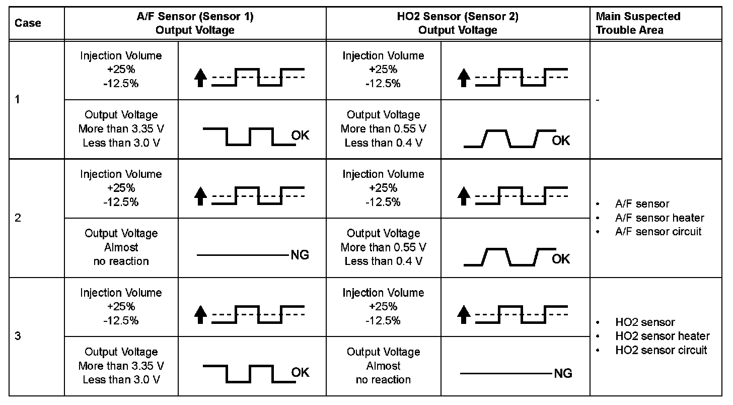- If either of the voltage outputs of the air-fuel Ratio (A/F) or Heated Oxygen (HO2) sensor does not fluctuate, or either of the sensors makes a noise, the sensor may be malfunctioning.