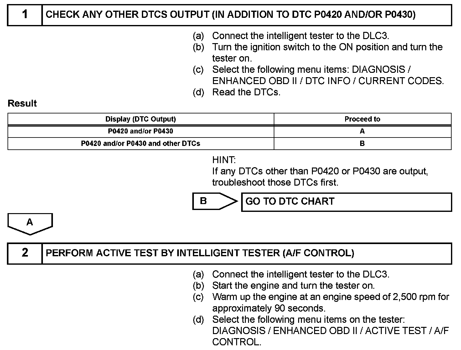 HINT: Intelligent tester only: Malfunctioning areas can be identified by performing the A/F CONTROL function provided in the ACTIVE TEST. The A/F CONTROL function can help to determine whether the air-fuel Ratio (A/F) sensor, Heated Oxygen (HO2) sensor and other potential trouble areas are malfunctioning. The following instructions describe how to conduct the A/F CONTROL operation using an intelligent tester.