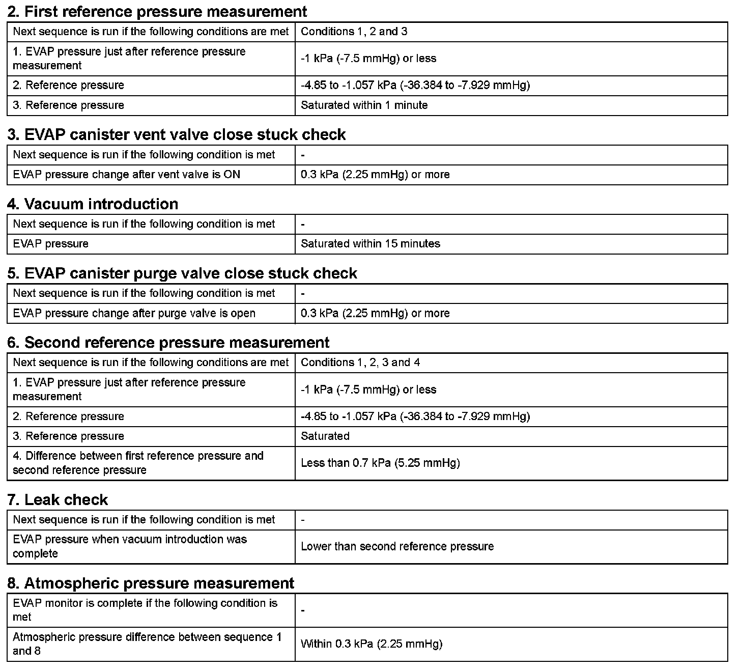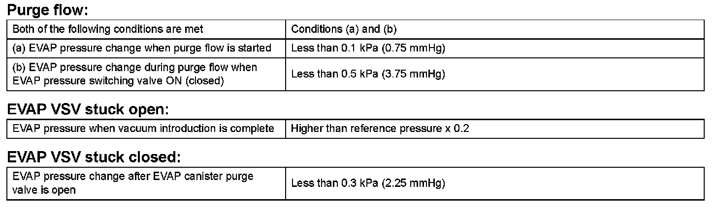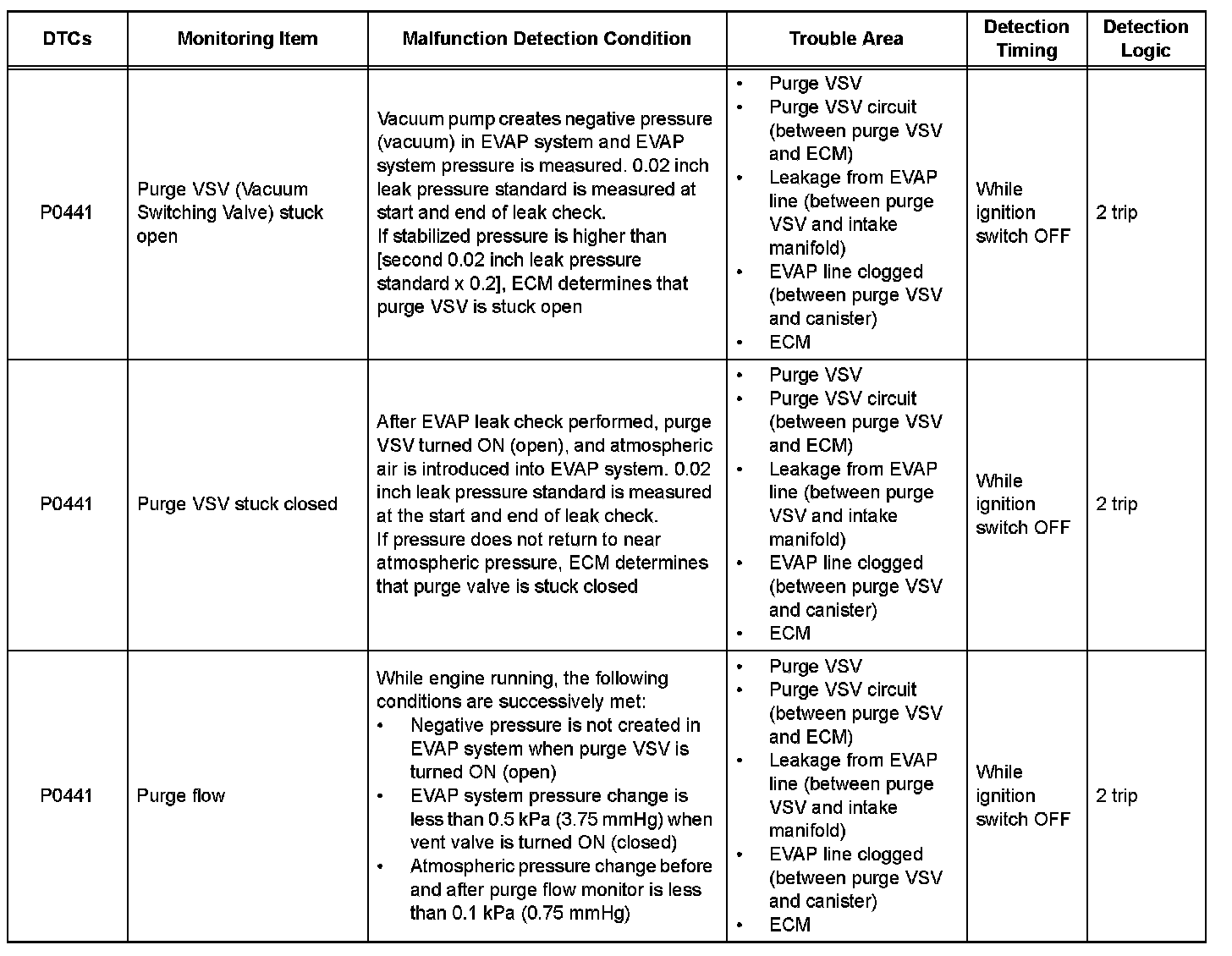 The vent valve is turned OFF (open) and the EVAP pressure is then measured. If the variation in the pressure is less than 0.5 kPa (3.75 mmHg), the ECM interprets this as the purge VSV being stuck closed, and illuminates the MIL and sets DTC P0441 (2 trip detection logic).
