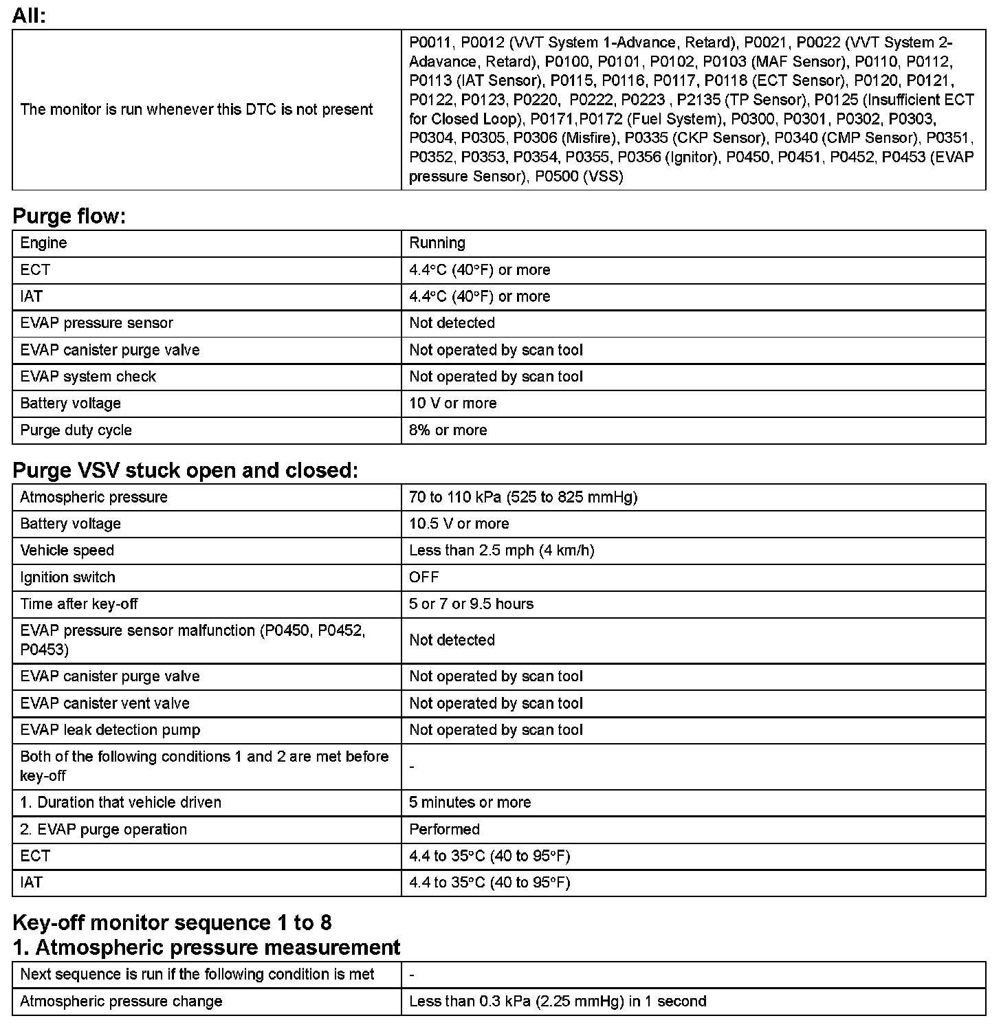 While the engine is running, if a predetermined condition (closed-loop, etc.) is met, the purge VSV is opened by the ECM and fuel vapors stored in the canister are purged to the intake manifold. The ECM changes the duty cycle ratio of the purge VSV to control purge flow volume. The purge flow volume is also determined by the intake manifold pressure. Atmospheric pressure is allowed into the canister through the vent valve to ensure that the purge flow is maintained when negative pressure (vacuum) is applied to the canister. The following two monitors run to confirm appropriate EVAP system operation.