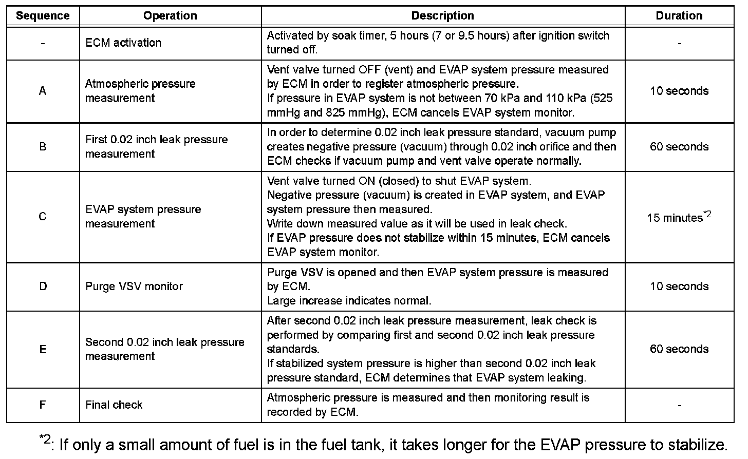 The two monitors, Key-Off and Purge Flow, are used to detect malfunctions relating to DTC P0441. The Key-off monitor is initiated by the ECM internal timer, known as the soak timer, 5 hours(*1) after the ignition switch is turned off. The purge flow monitor runs while the engine is running.