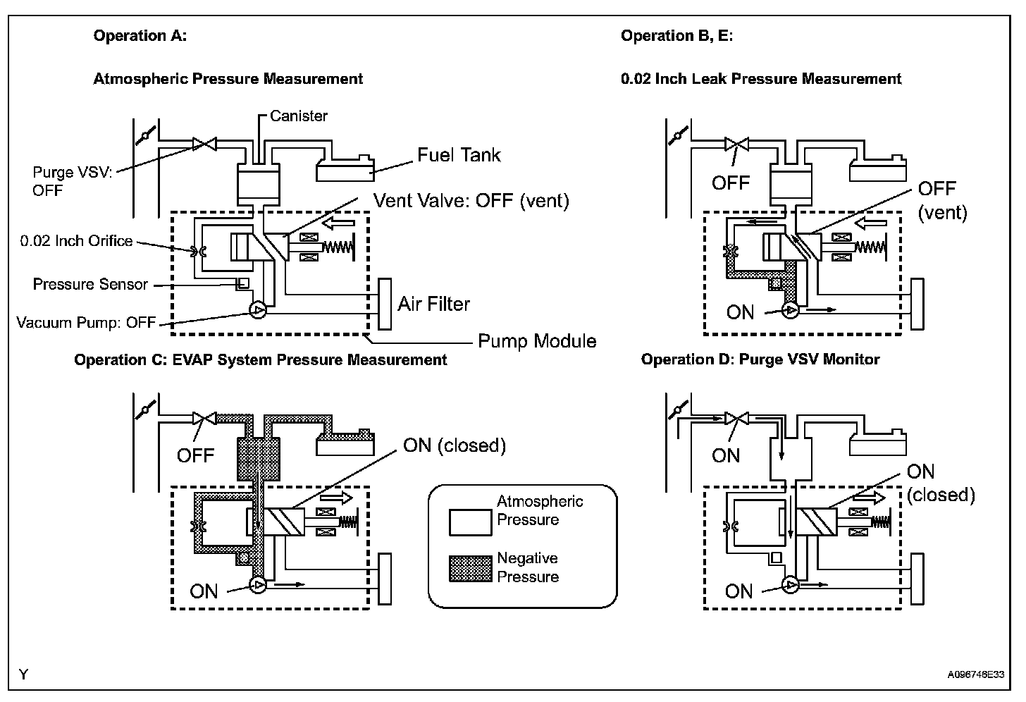 The electric vacuum pump creates negative pressure (vacuum) in the EVAP system, and the pressure is measured. Finally, the ECM monitors for leaks from the EVAP system and malfunctions in both the pump module and purge VSV, based on the EVAP pressure.