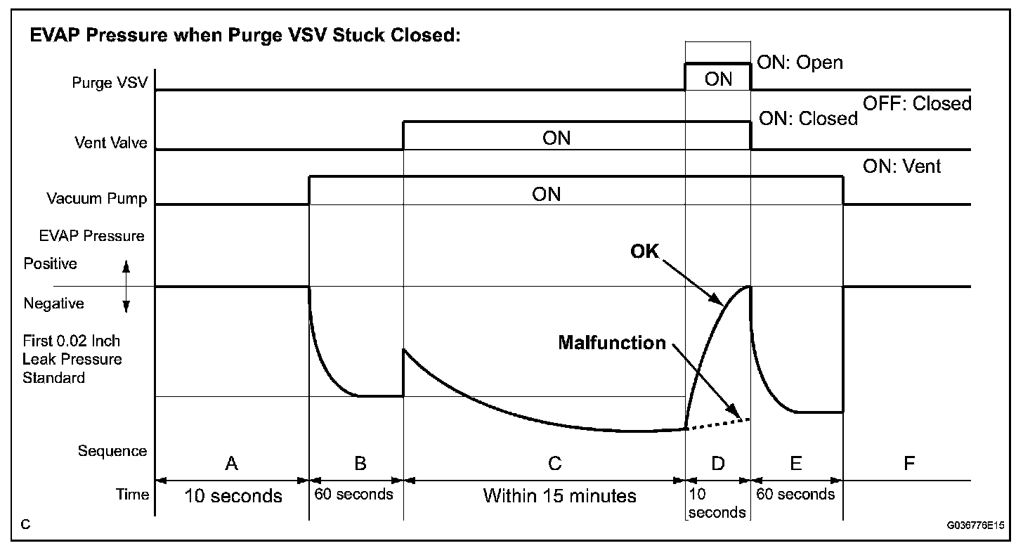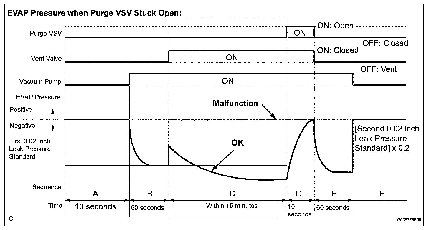a. Purge VSV stuck open In operation C, the vacuum pump creates negative pressure (vacuum) in the EVAP (Evaporative Emission) system. The EVAP system pressure is then measured by the ECM using the pressure sensor. If the stabilized system pressure is higher than [second 0.02 inch leak pressure standard x 0.2], the ECM interprets this as the purge VSV (Vacuum Switching Valve) being stuck open. The ECM illuminates the MIL and sets the DTC (2 trip detection logic).