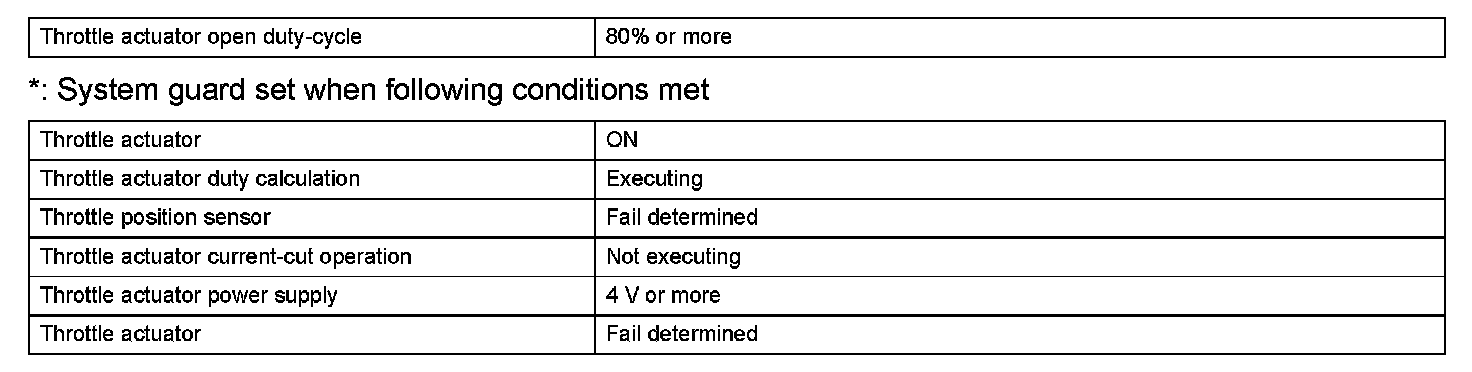 The ECM determines that there is a malfunction in the ETCS when the throttle valve remains at the fixed angle despite a high drive current from the ECM. The ECM illuminates the MIL and sets a DTC. If the malfunction is not repaired successfully, a DTC is set when the accelerator pedal is fully depressed and released quickly (to fully open and close the throttle valve) after the engine is next started.