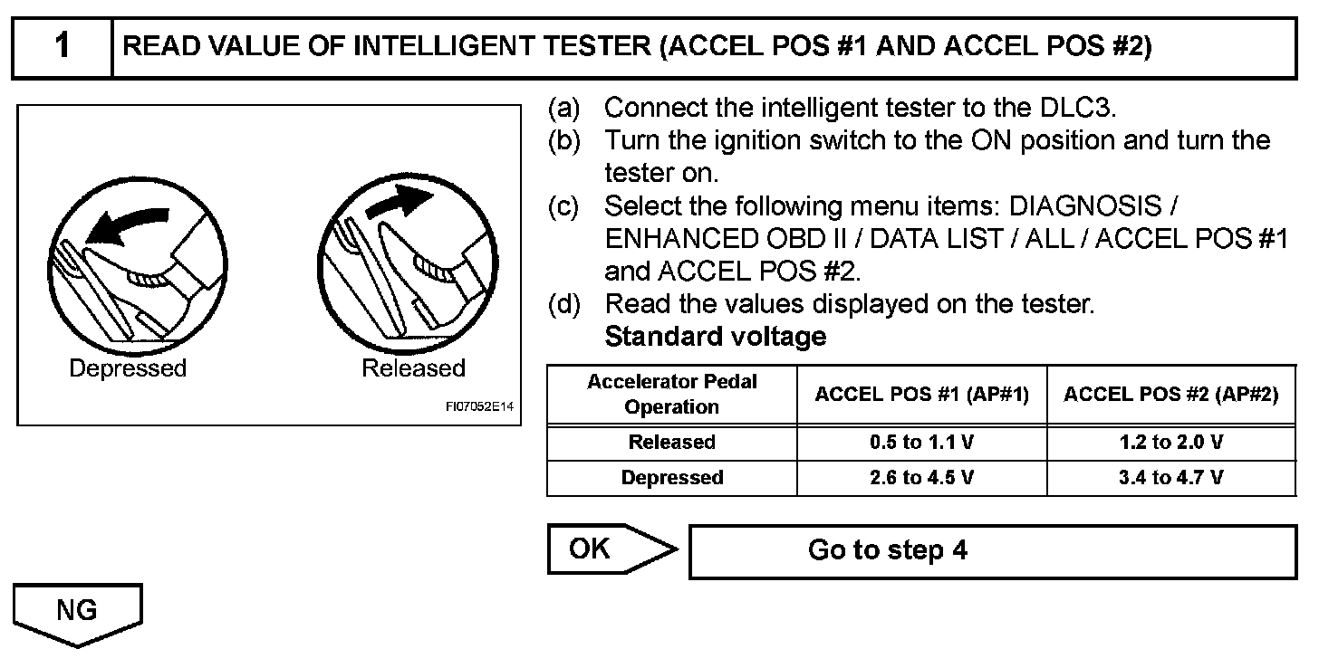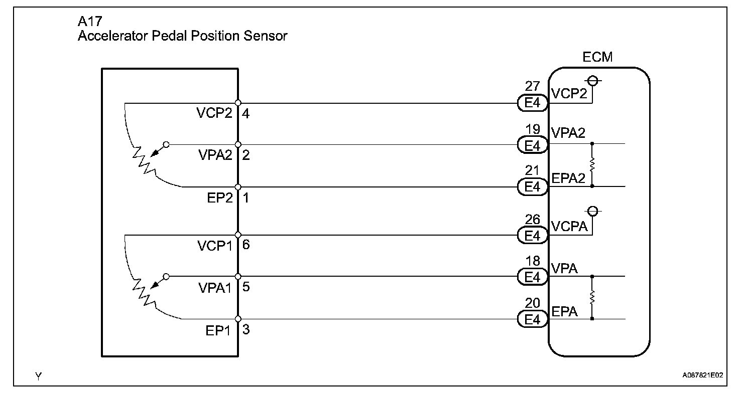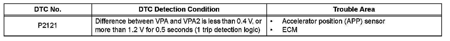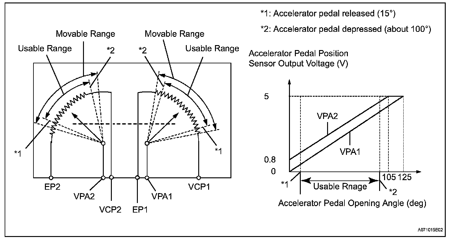 The accelerator pedal position sensor is mounted on the accelerator pedal bracket. The accelerator pedal position sensor has 2 sensor elements and 2 signal outputs: VPA and VPA2. VPA is used to detect the actual accelerator pedal angle (used for engine control) and VPA2 is used to detect malfunctions in VPA. When the difference between the voltage outputs of VPA and VPA2 deviates from the standard, the ECM determines that the accelerator pedal position sensor is malfunctioning. The ECM turns on the MIL and the DTC is set.