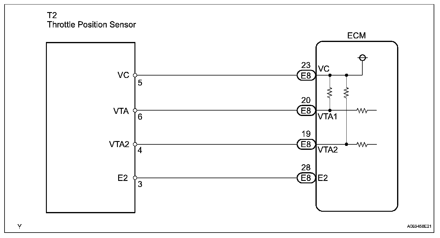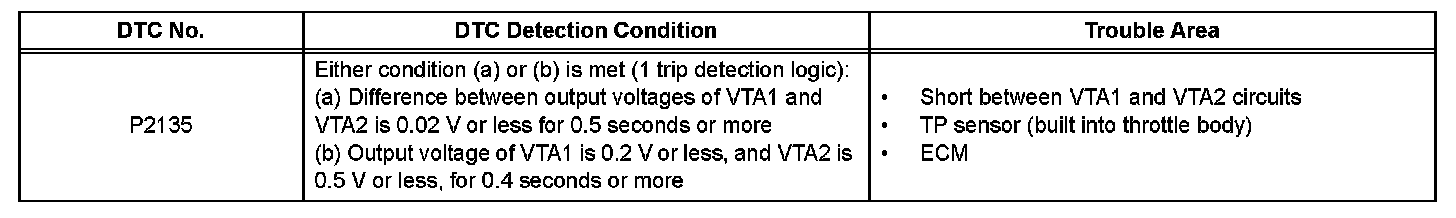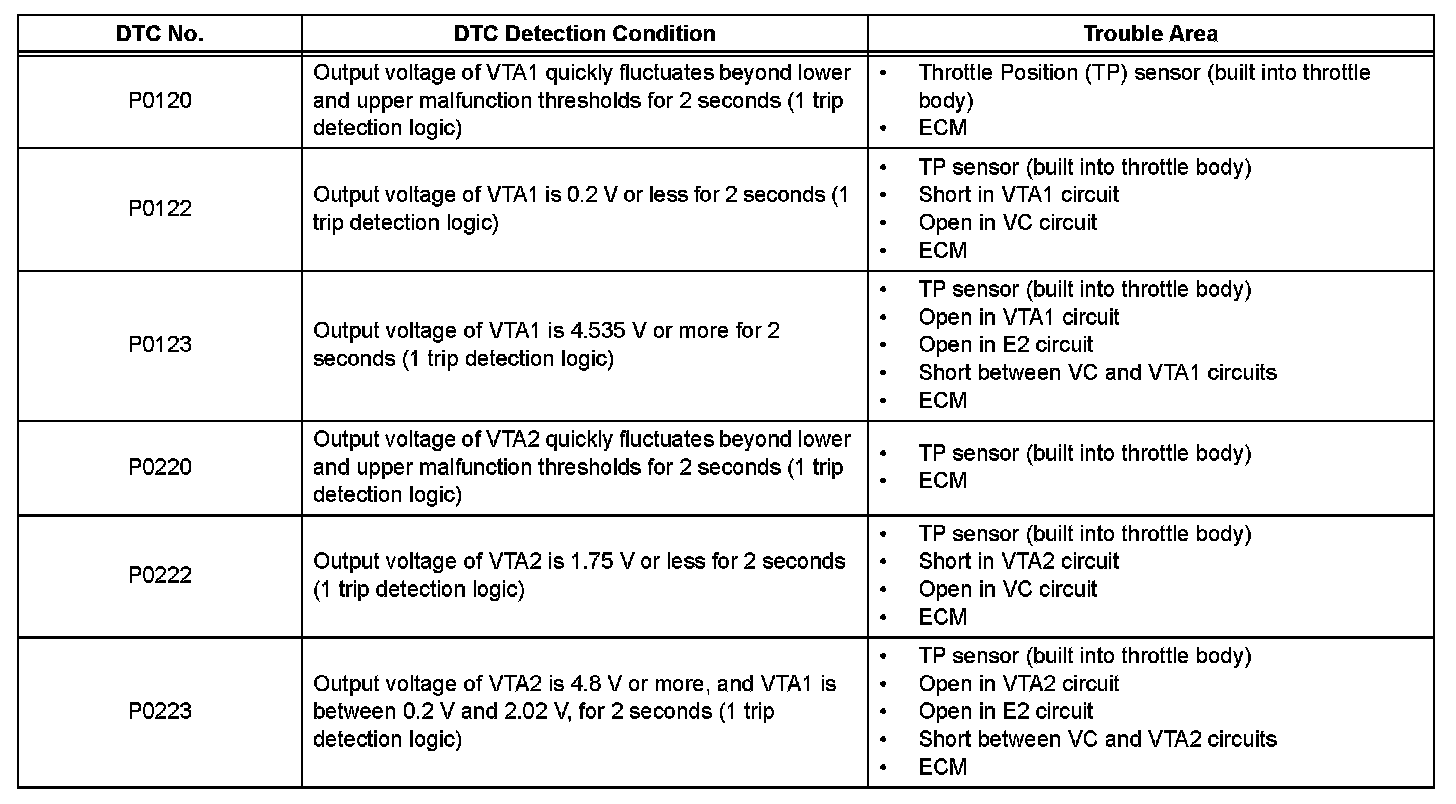 - VTA1 and VTA2 should never be close to the same voltage level. If VTA1 is within 0.02 V of VTA2, the ECM determines that there is a short circuit in the sensor, and sets a DTC. If the malfunction is not repaired successfully, a DTC is set 2 seconds after the engine is next started.