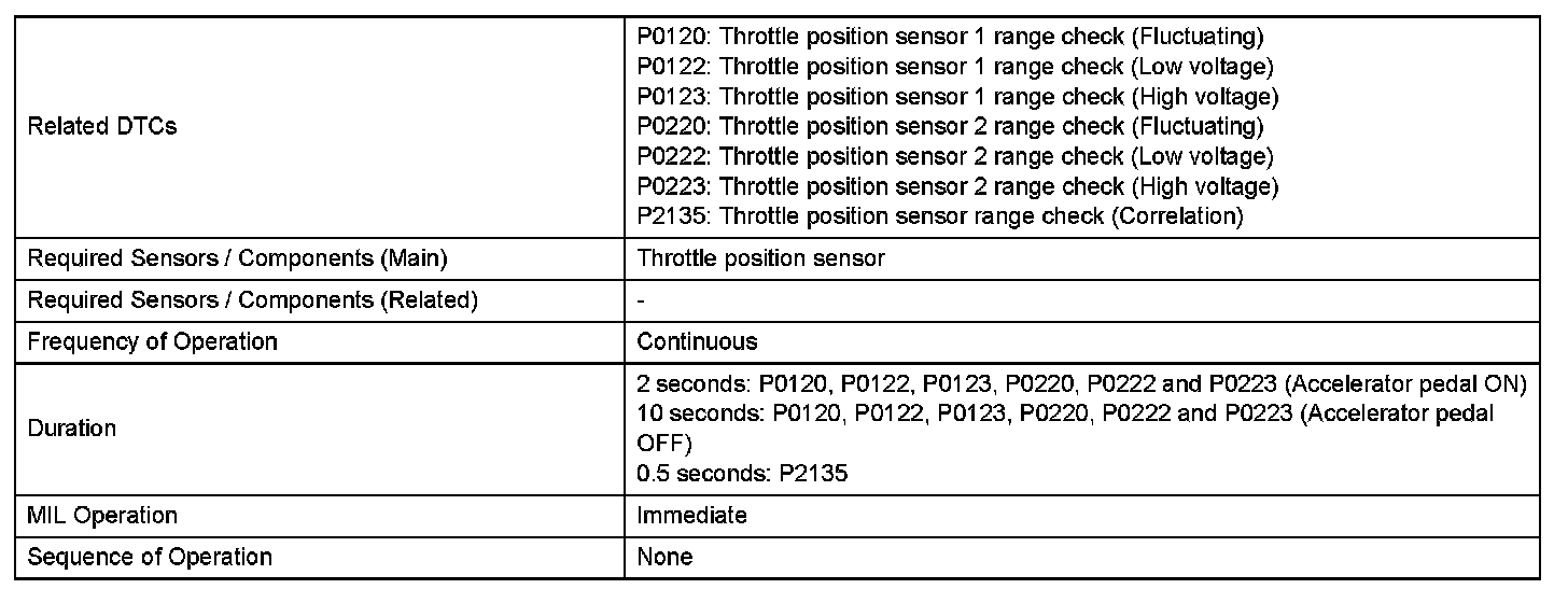 The ECM uses the Throttle Position (TP) sensor to monitor the throttle valve opening angle. There are several checks that the ECM performs to confirm the proper operation of the TP sensor.