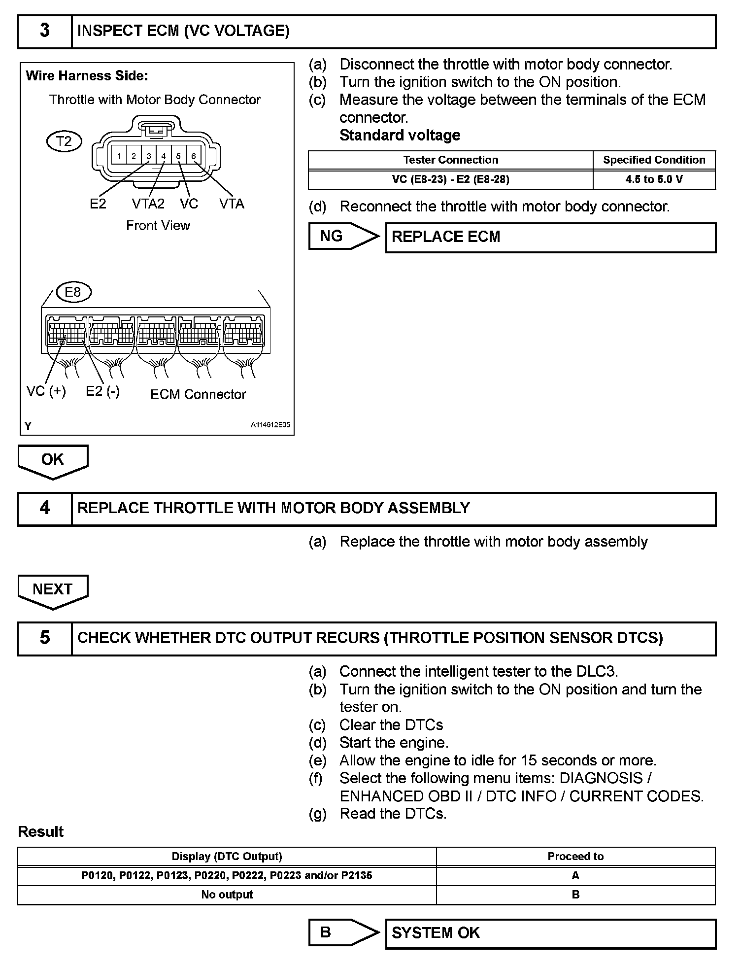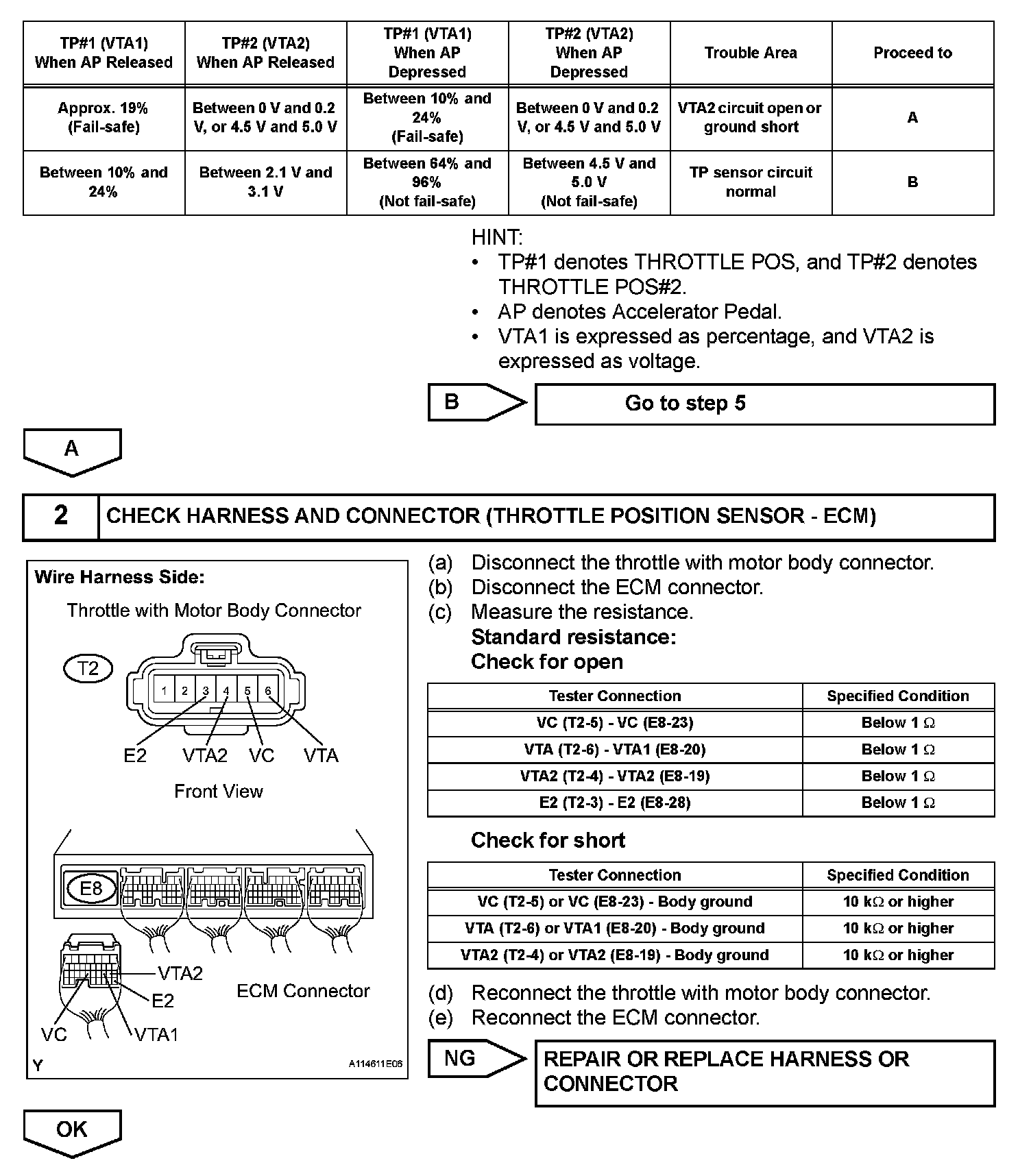 - A specific voltage difference is expected between the sensor terminals, VTA1 and VTA2, for each throttle valve opening angle. If the difference between VTA1 and VTA2 is incorrect, the ECM interprets this as a malfunction in the sensor, and sets a DTC.