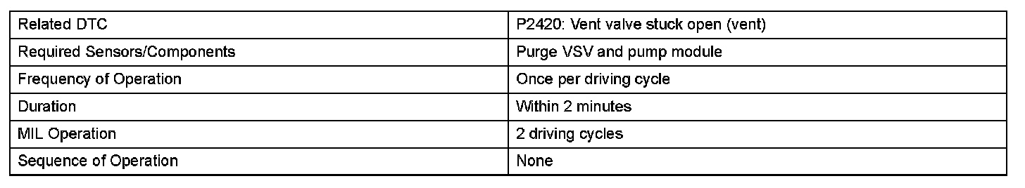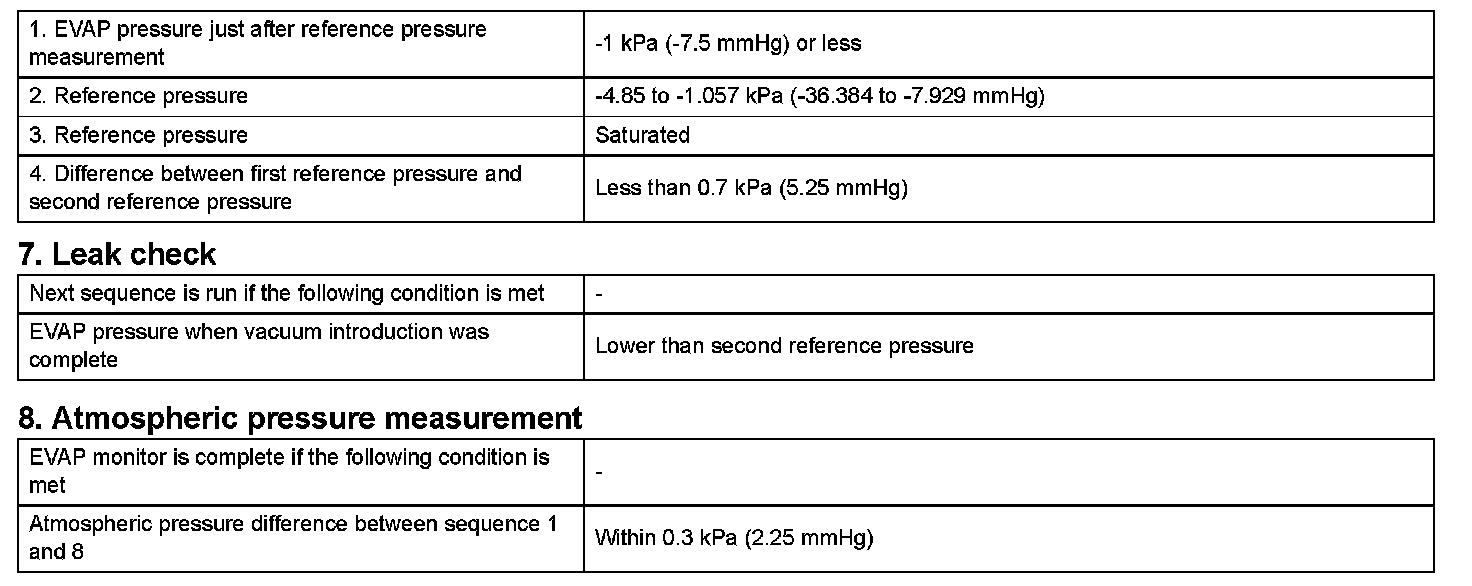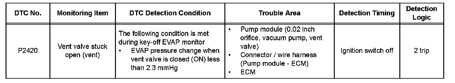 The vent valve is turned OFF (open) and the EVAP pressure is then measured. If the variation in the pressure is less than 0.5 kPa (3.75 mmHg), the ECM interprets this as the purge VSV being stuck closed, and illuminates the MIL and sets DTC P0441 (2 trip detection logic).