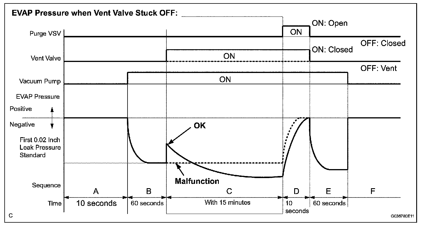 The vent valve turns ON (closes) and the EVAP (Evaporative Emission) system pressure is then measured by the ECM, using the pressure sensor, to conduct an EVAP leak check. If the pressure does not increase when the vent valve is open, the ECM interprets this as the vent valve being stuck open. The ECM illuminates the MIL and sets the DTC.