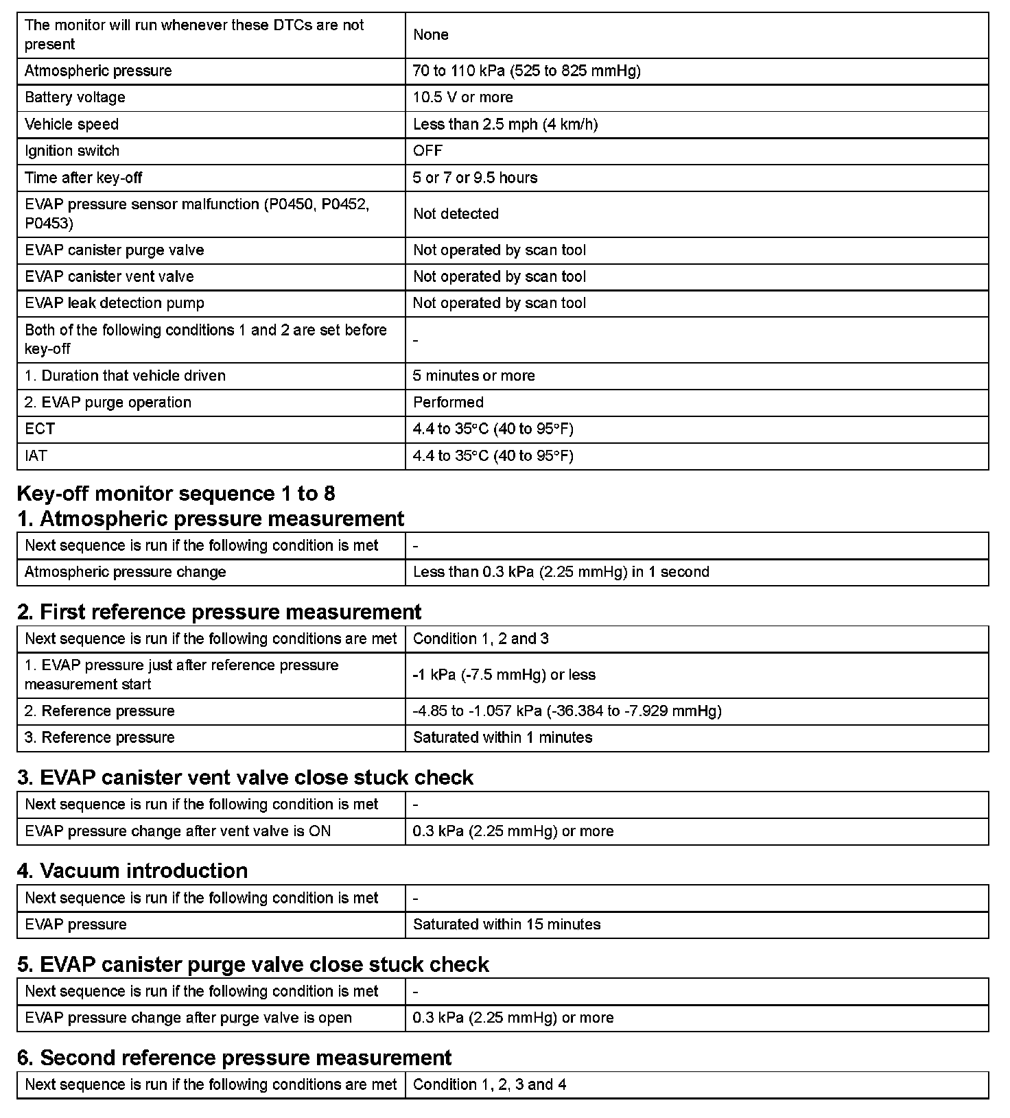 This monitor checks for EVAP (Evaporative Emission) system leaks and pump module malfunctions. The monitor starts 5 hours* after the ignition switch is turned off. More than 5 hours are required to allow the fuel to cool down to stabilize the Fuel Tank Pressure (FTP), thus making the EVAP system monitor more accurate.