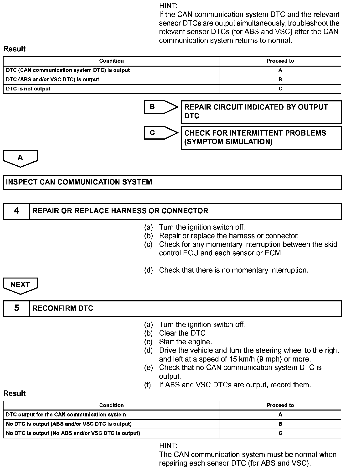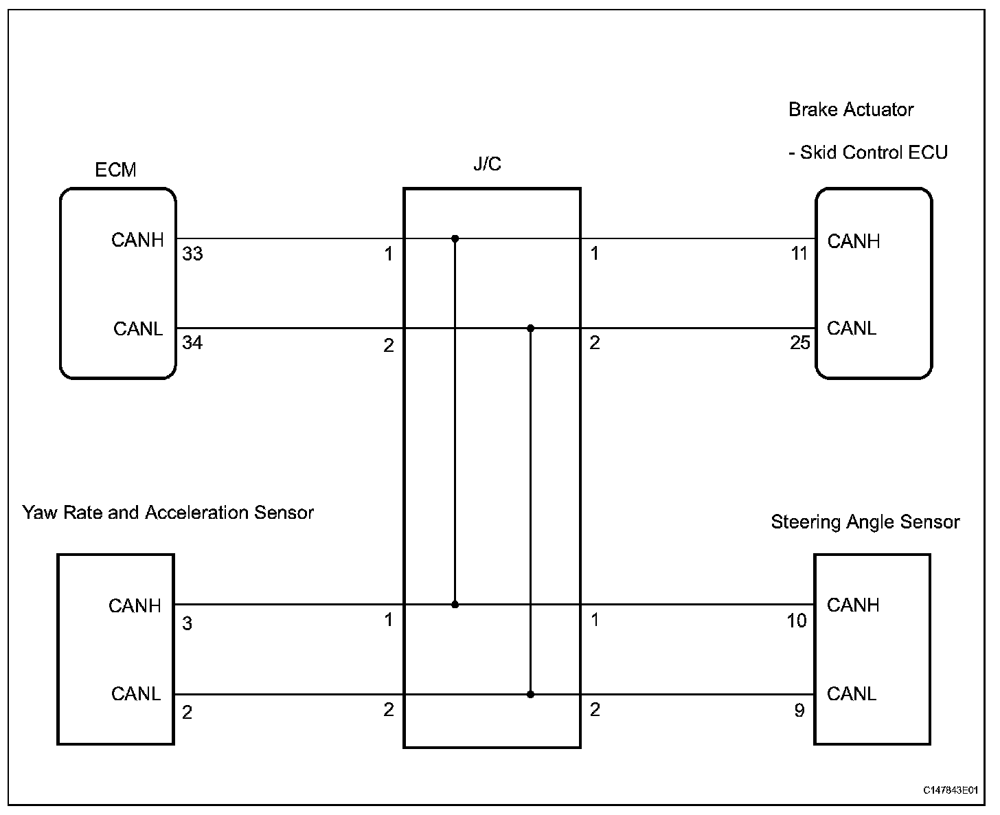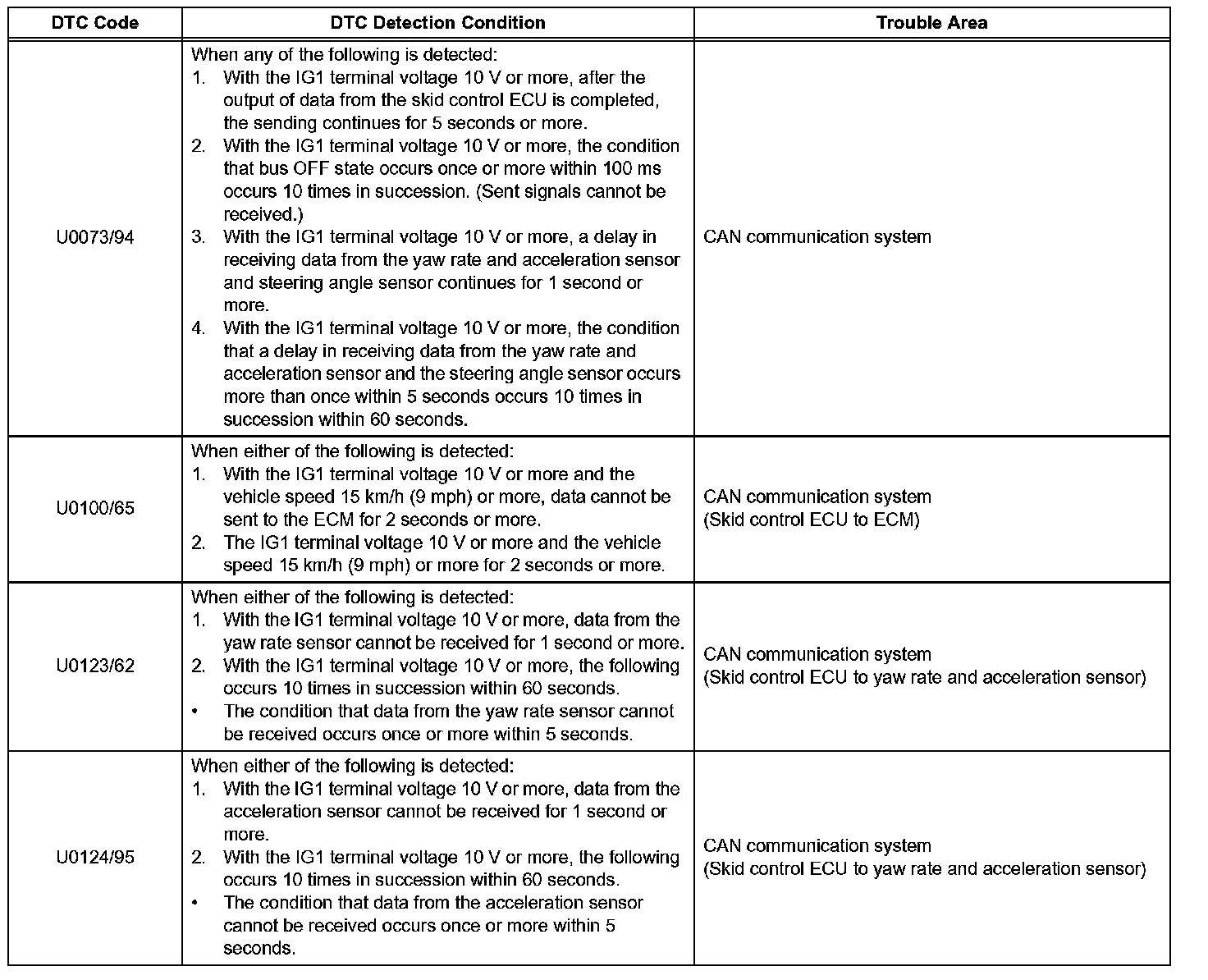 The skid control ECU receives the signals from the ECM, steering angle sensor, and yaw rate and acceleration sensor via the CAN communication system.