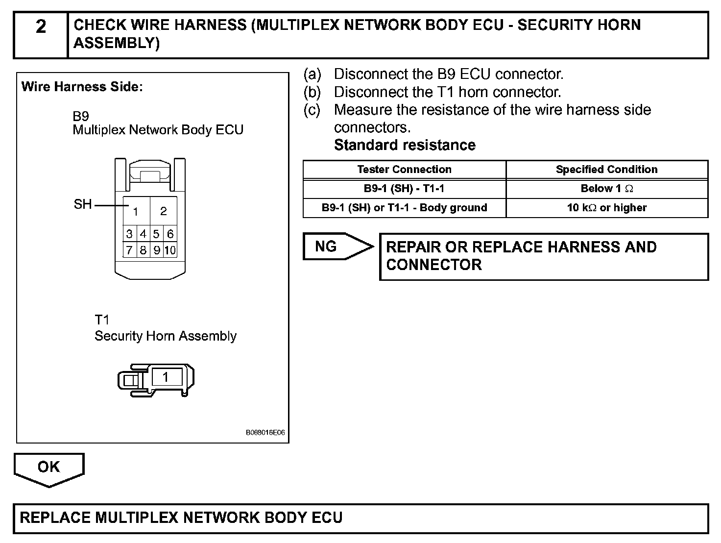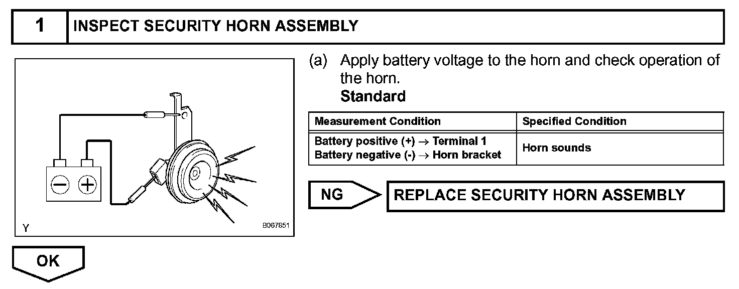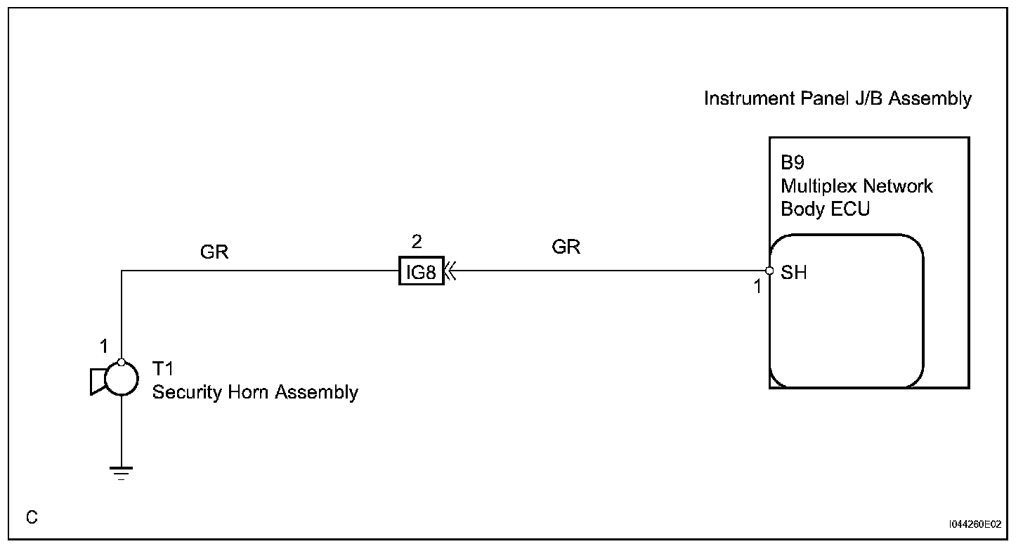 When the theft deterrent system is operating, a relay in the multiplex network body ECU turns ON and OFF continuously at 0.2 second intervals, causing the security horn to sound.