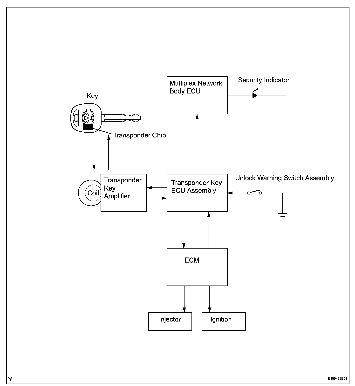 - When the ECU detects that the unlock warning switch is ON, the ECU provides current to the transponder key coil and produces a faint electric wave. A transponder chip in the key grip receives the faint electric wave. Upon receiving the faint electric wave, the transponder chip outputs a key ID code signal. The transponder key coil receives this signal, the transponder key amplifier amplifies it, and then the signal is transmitted to the ECU. The ECU matches the key's ID code with the vehicle's ID code, which was previously registered in the ECU and then communicates the results to the ECM using the SFI communication.