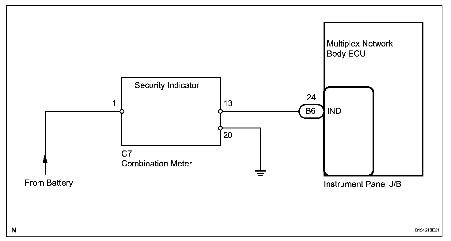 When the theft deterrent system is in the disarmed state, the security indicator will flash continuously if the immobilizer system is set, or not illuminate if the immobilizer system is not set. When the theft deterrent system is in the armed state, the immobilizer system is automatically set and the security indicator will flash continuously. When the theft deterrent system is in the arming preparation state or alarm sounding state, the multiplex network body ECU causes the security indicator to be illuminated.