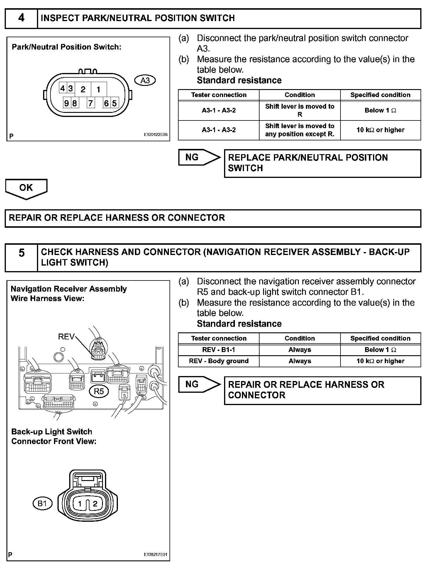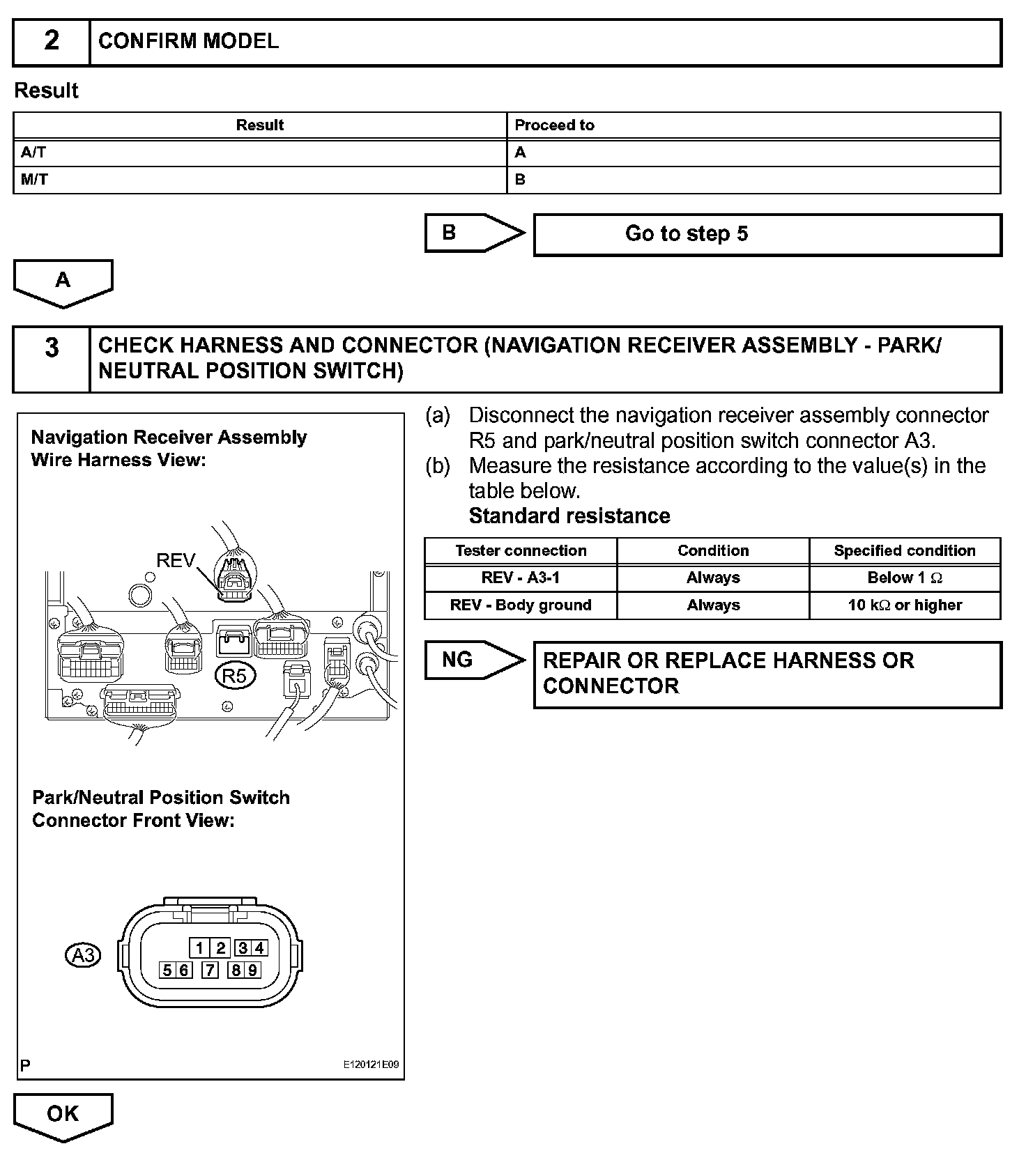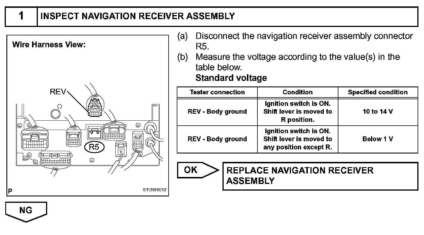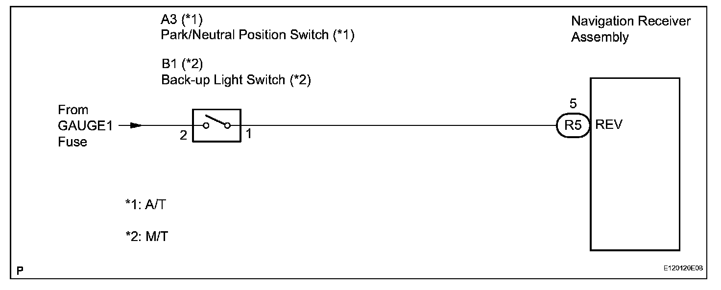 The navigation receiver assembly receives a reverse signal from the park/neutral position switch (back-up light switch) and information about the GPS antenna, and then adjusts vehicle position.