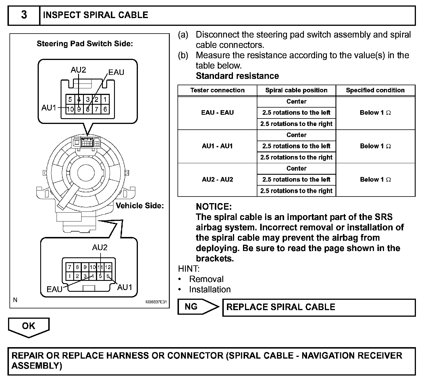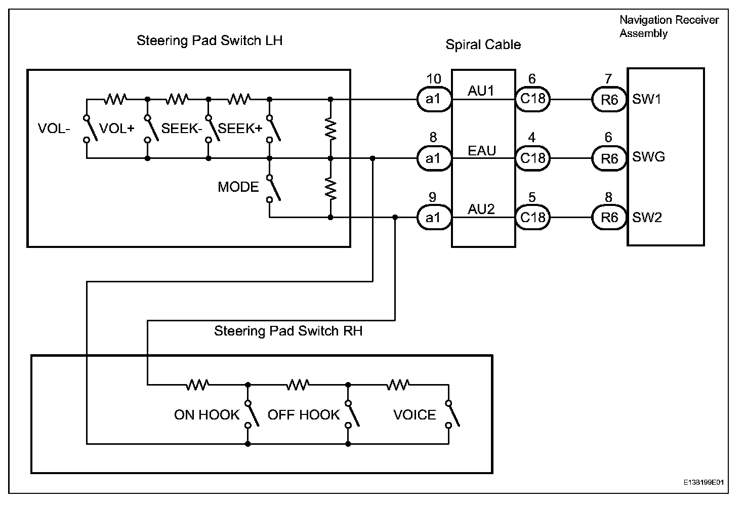 This circuit sends an operation signal from the steering pad switch to the navigation receiver assembly. If there is an open in the circuit, the navigation system cannot be operated using the steering pad switch. If there is a short in the circuit, the resulting condition is the same as if the switch were continuously depressed. Therefore, the navigation receiver assembly cannot be operated using the steering pad switch, and the navigation receiver assembly itself cannot function.