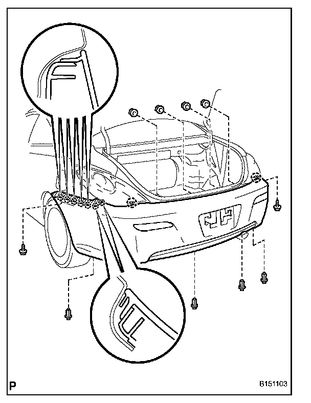 c. Install the rear bumper assembly with the 2 screws, 4 nuts and 4 clips.
