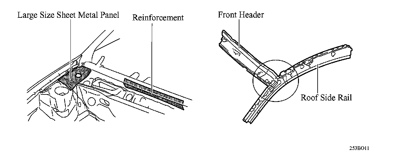 (3) To prevent the windshield glass from vibrating, reinforcement is used in the cowl, and the joining of the front header and the roof side rail is made more rigid.
