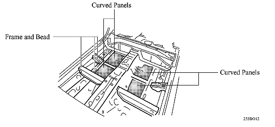 (5) A curved panel is used for most of the front floor panels in order to ensure a high level of rigidity. The frame and beads that separate the floor surface help prevent the floor panel from vibrating.