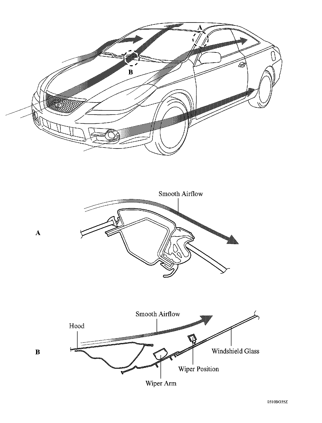 ^ Windshield wipers are hidden by the hood to keep them out of the airflow to reduce wind-noise.