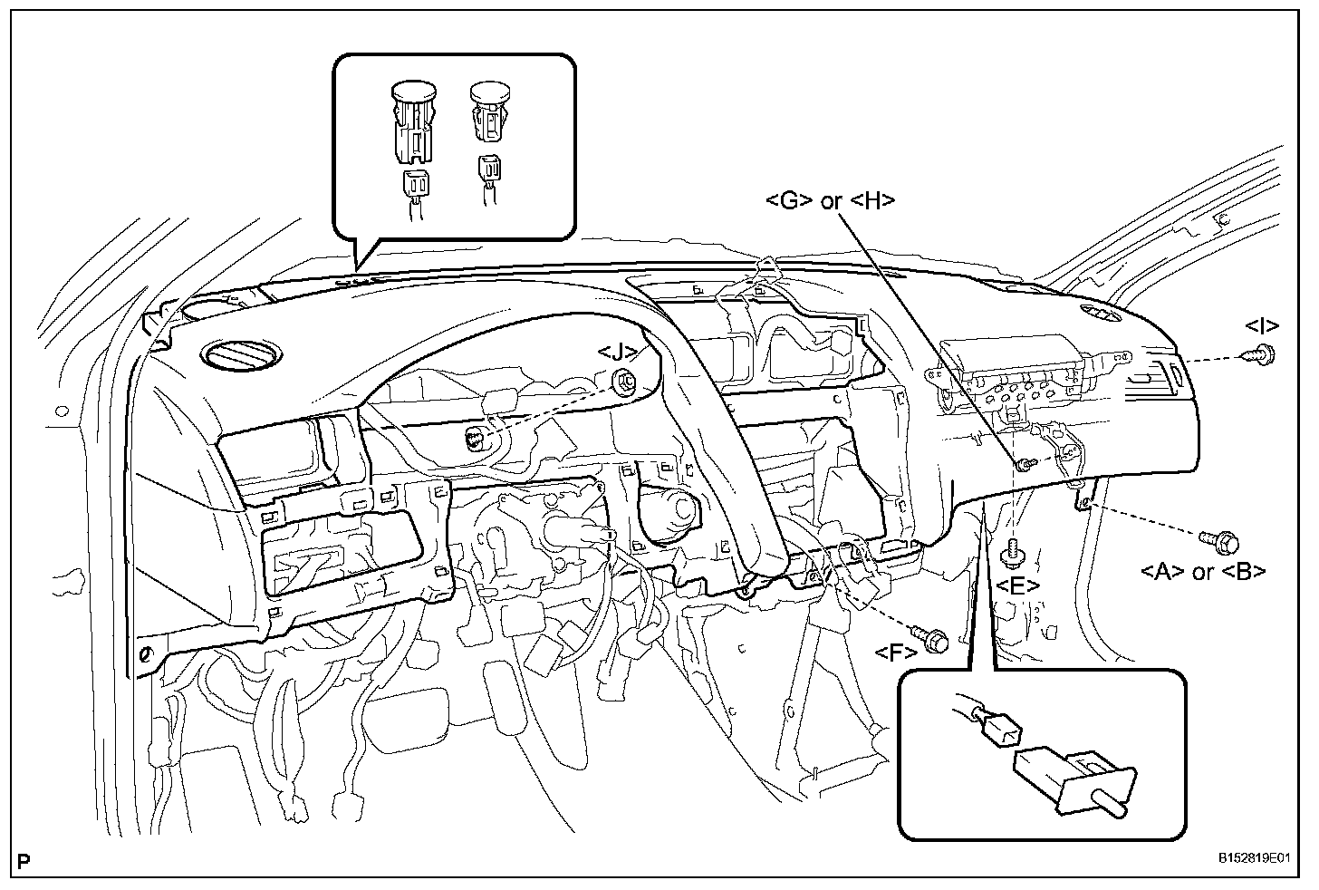 d. Install the instrument panel safety pad sub-assembly with the bolts or ,