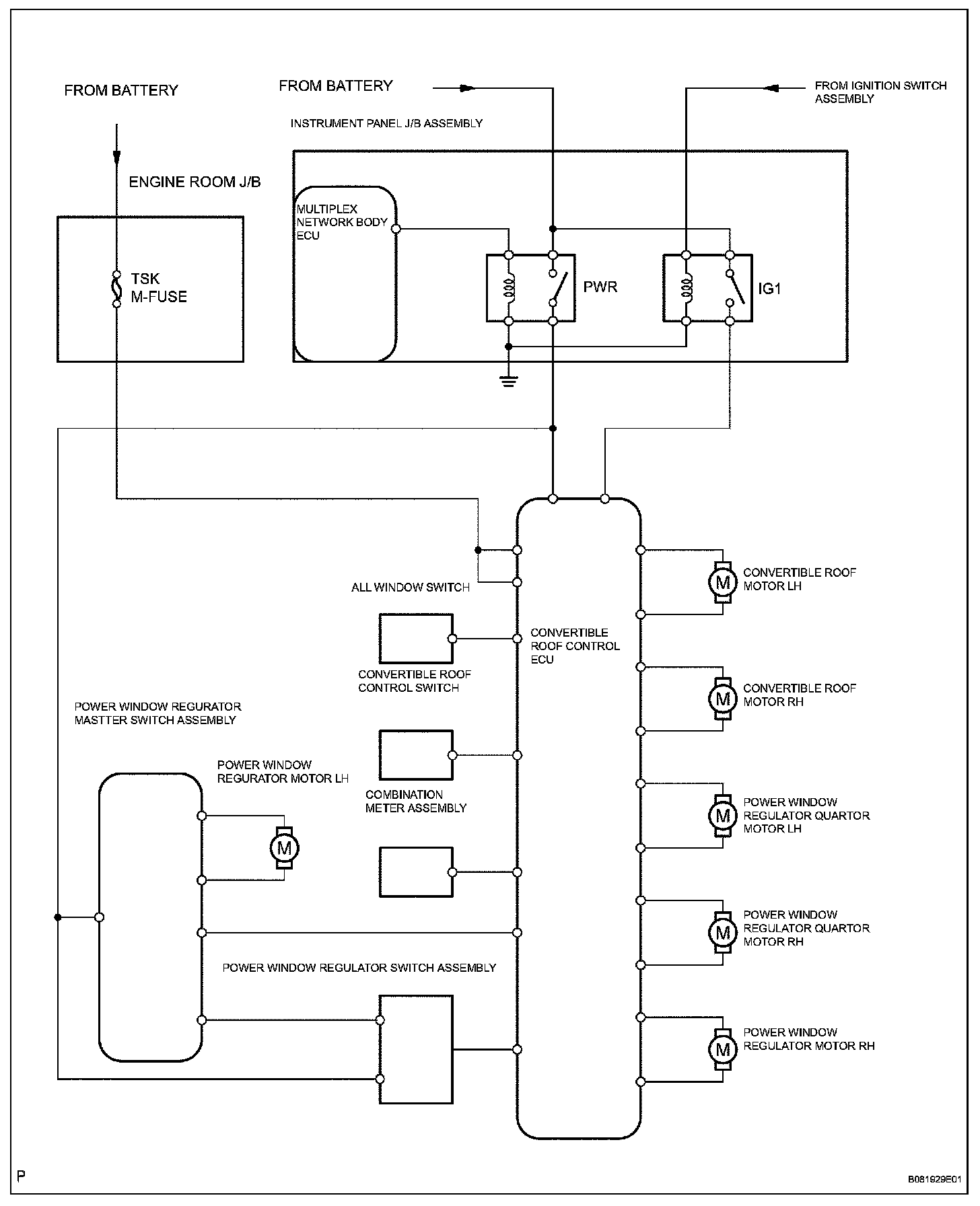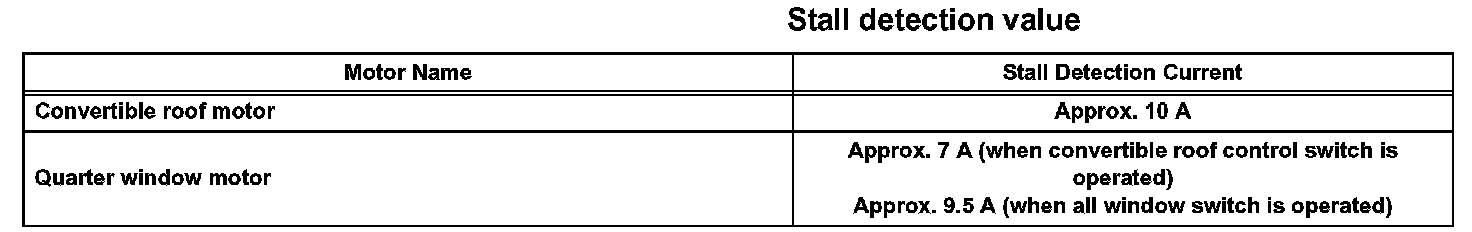 1. The convertible roof control ECU has a function to detect the stalling of the roof motors and quarter window motors by detecting of current (amperage) applied to the motors. When the ECU detects the stalling of any motor, it will stop actuating the motor.