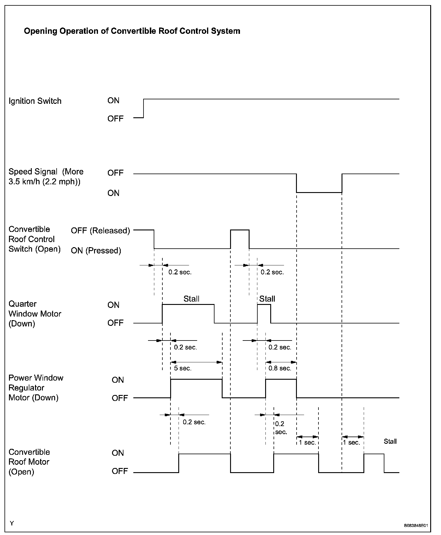 a. If the roof control OPEN/CLOSE switch is pressed, the convertible roof control ECU will start opening both quarter windows (0.2 seconds after the switch is pressed) and start opening both door windows (0.4 seconds after the switch is pressed) before opening or closing the soft top (0.6 seconds after the switch is pressed).