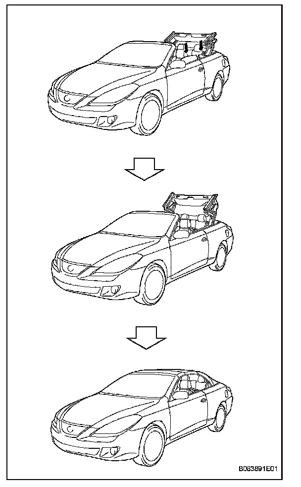 a. Turn the ignition switch ON and make sure the vehicle is stopped. Press and hold the convertible roof control CLOSE switch. 0.2 seconds after the CLOSE switch is pressed, a quarter window motor open signal is sent and the quarter windows open. 0.4 seconds after the CLOSE switch is pressed, a power window regulator motor open signal is sent and the door windows open. 0.6 seconds after the CLOSE switch is pressed, a roof motor close signal is sent and the soft top roof closes.