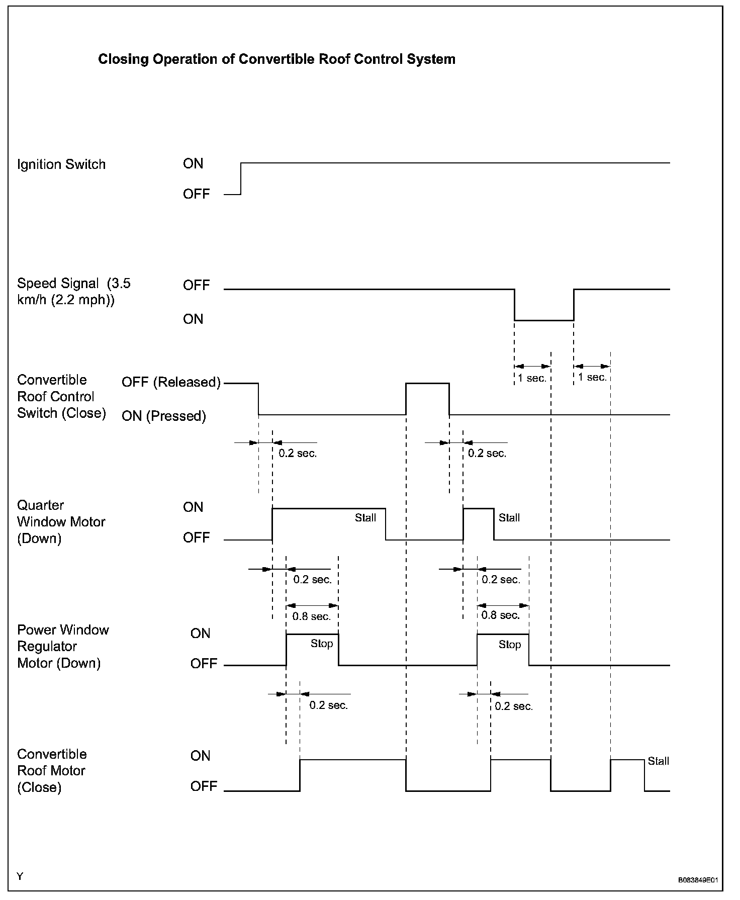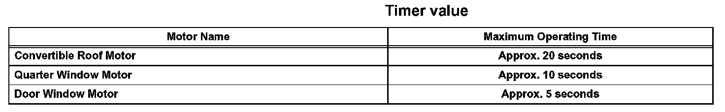 - The door window motors operate according to the convertible roof control ECU's output signals for 5 seconds when the soft top is opened (0.8 seconds when the roof control OPEN switch is pressed a second time) and 0.8 seconds when the soft top is closed.