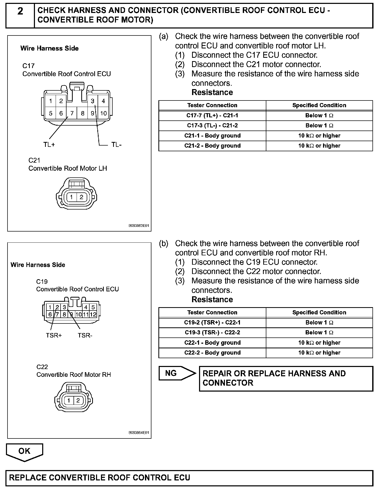 The convertible roof control ECU can determine if a roof motor has stalled by checking the motor's amperage level. If the soft top is fully open/closed but the motors have a current of 10 A, the ECU assumes that the motors are stalled and sends a stop signal to deactivate the motors.