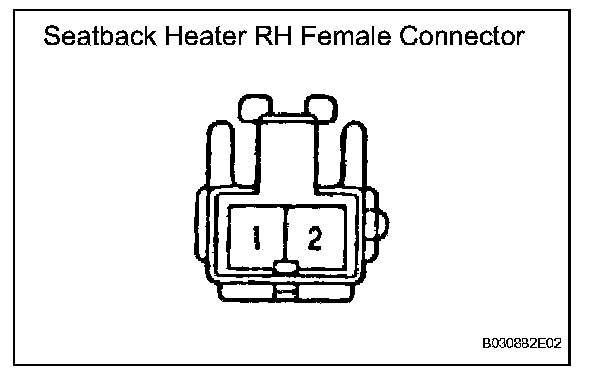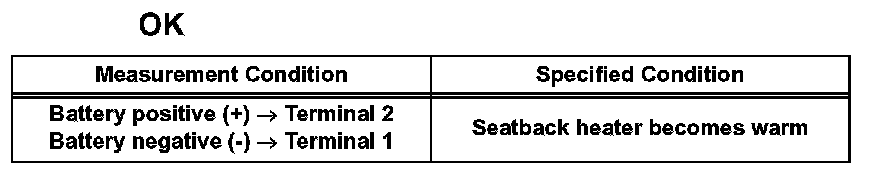 If the result is not as specified, replace the seatback heater assembly.