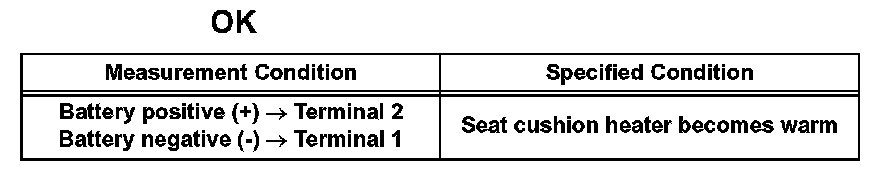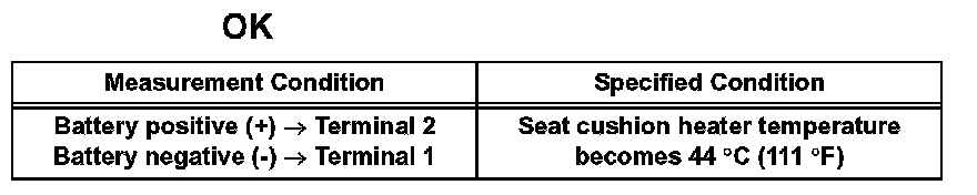If the result is not as specified, replace the seat cushion heater assembly.