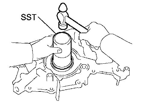 (a) Using SST and a hammer, install a new oil seal. Tap the surface of the SST with the hammer until the oil seal's surface is flush with oil pump body edge.
