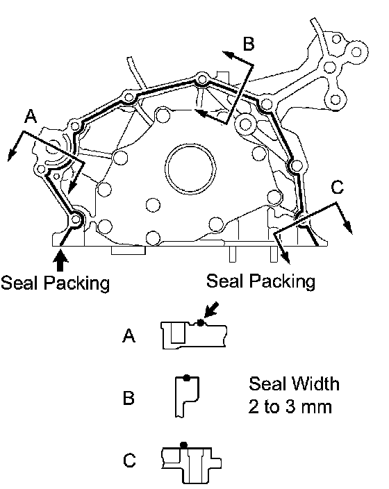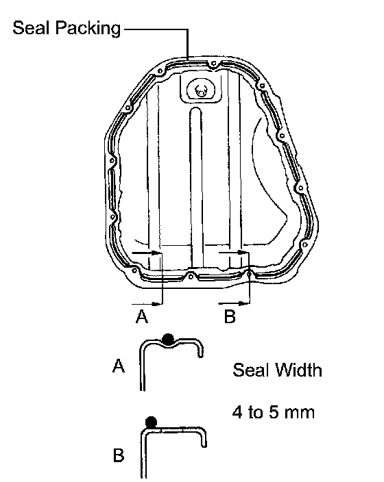 (b) Apply a continuous bead of seal packing (diameter: 3 to 4 mm (0.12 to 0.16 inch)) as shown in the illustration.