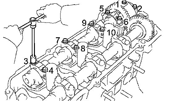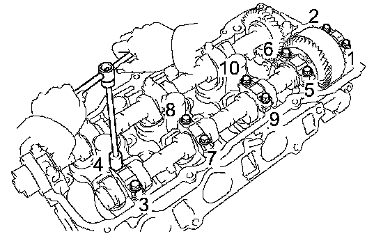 (c) Uniformly loosen and remove the 10 bearing cap bolts in the sequence shown in the illustration. Remove the 5 bearing caps and the camshaft.