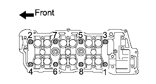 (b) Uniformly loosen the 8 cylinder head bolts in the sequence shown in the illustration. Remove the 8 cylinder head bolts and plate washers.