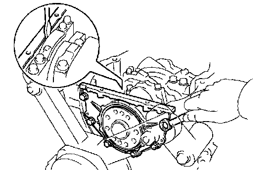 (b) Using a screwdriver, remove the oil seal retainer by prying between the oil seal retainer and the main bearing cap.