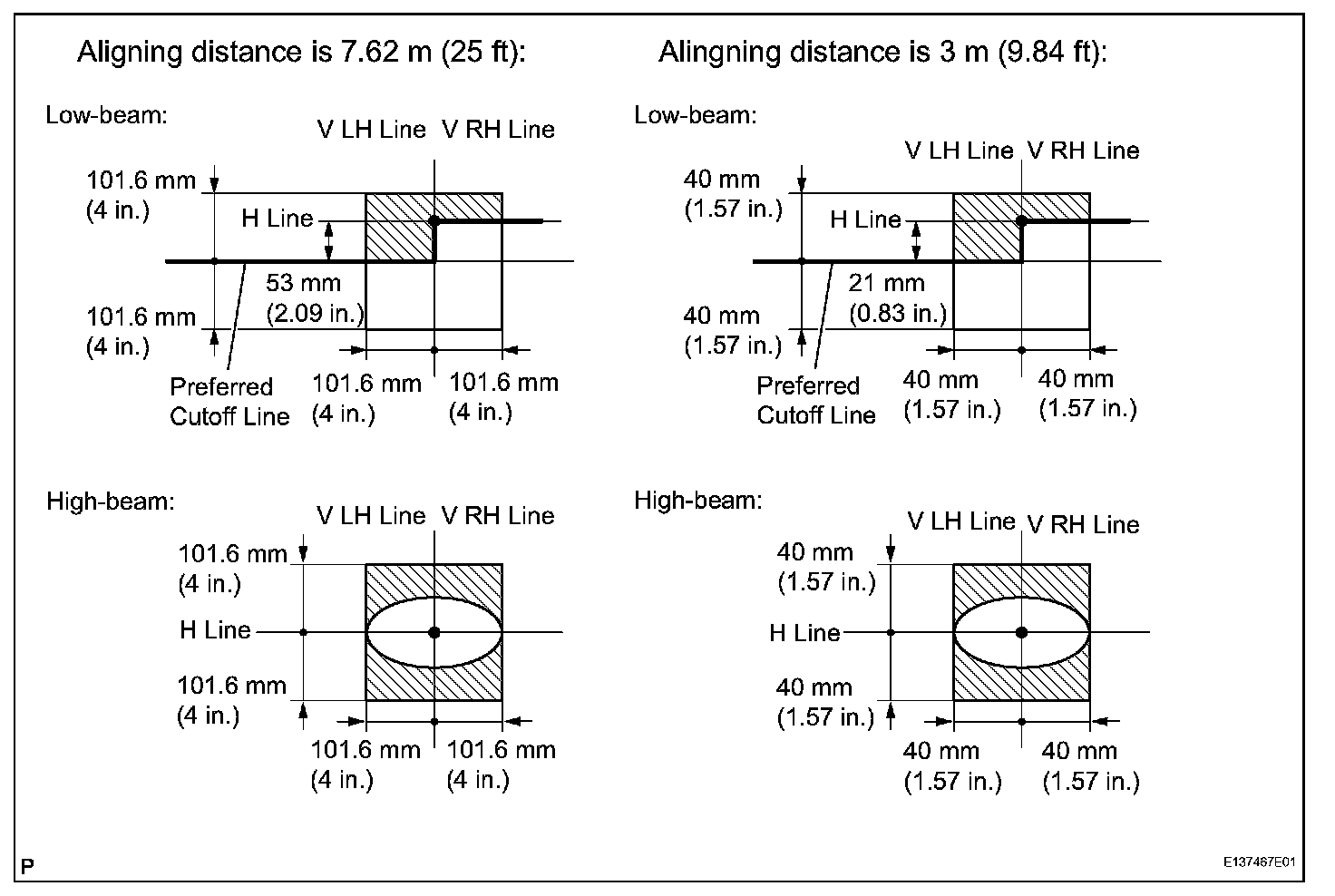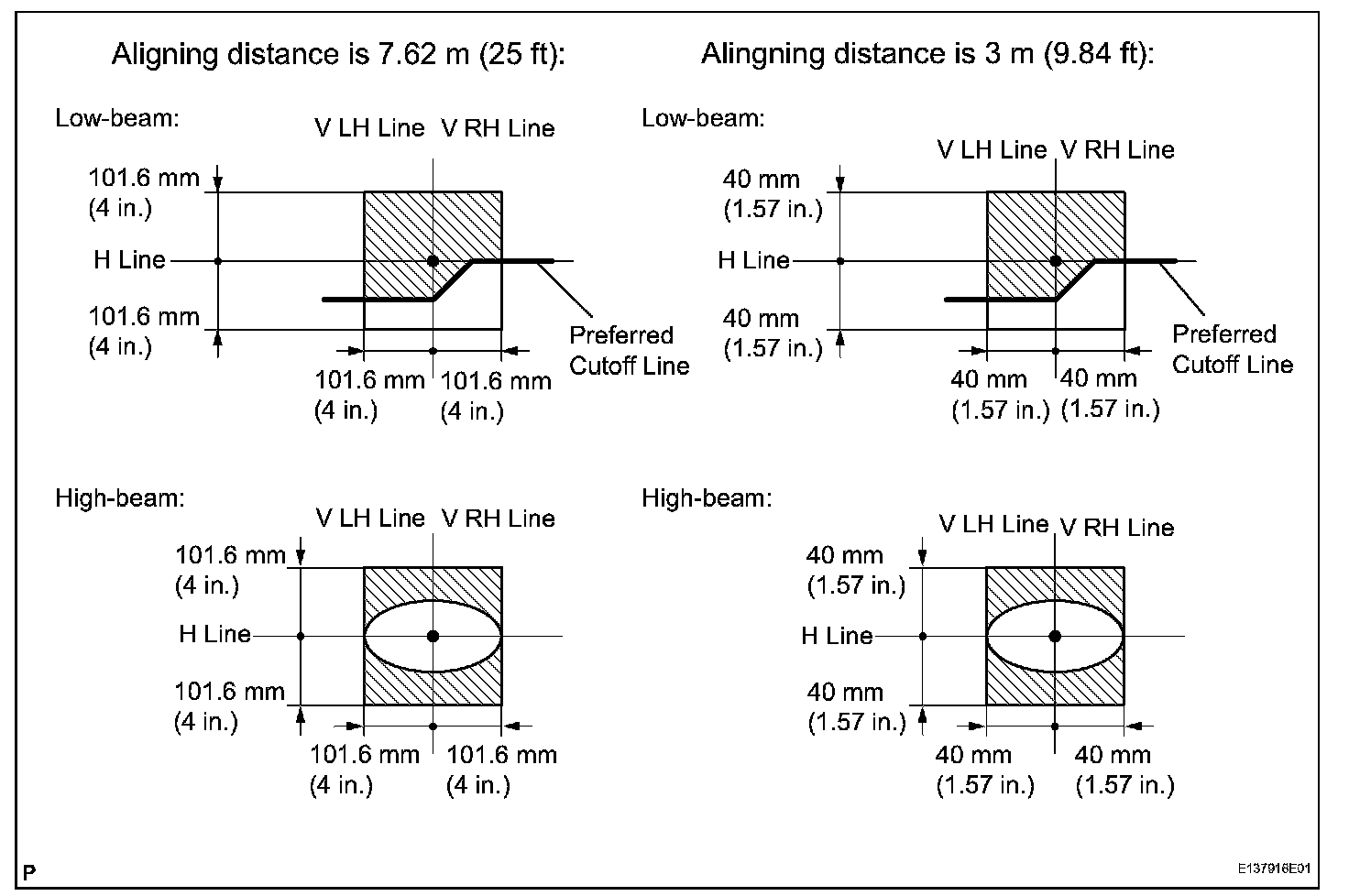 - If the alignment distance is 7.62 m (25 ft): The cutoff line should be within 101.6 mm (4 in.) above or below the H line as well as 101.6 mm (4 in.) left or right of the V line with low-beam (SAE J599).