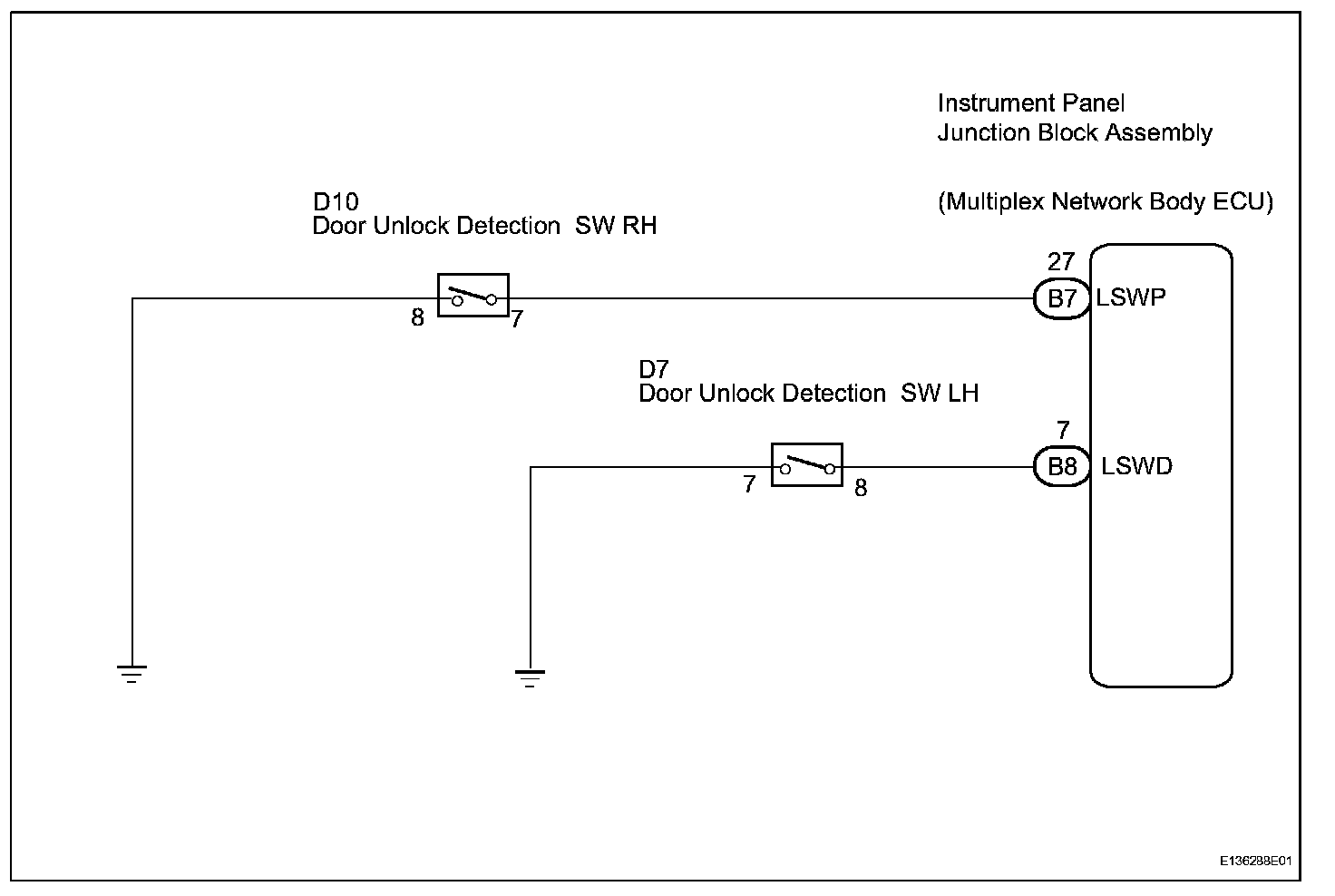 This circuit detects the state of the door lock detection sensor and sends it to the multiplex network body ECU.