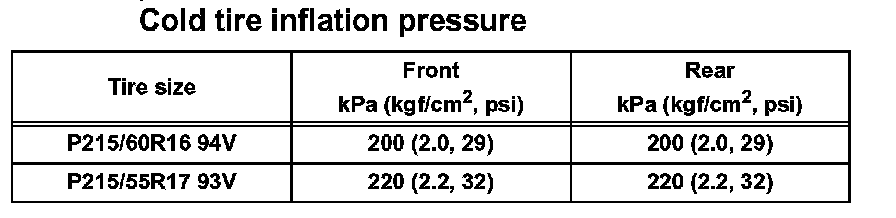 When driving under the above vehicle conditions at sustained high speeds above 160 km/h (100 mph), in countries where such speeds are permitted by law, inflate the front and rear tires to 240 kPa (2.4 kgf/cm2, 35 psi) provided that it does not exceed the maximum cold tire inflation pressure molded on the tire sidewall.