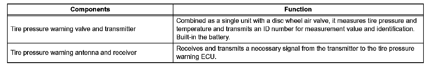 (a) A tire pressure warning valve and transmitter is equipped with a tire pressure sensor and a transmitter and is installed in a tire wheel assembly. The sensor measures the tire pressure. The measured value and transmitter ID are transmitted to the tire pressure warning antenna and receiver on the body as radio waves and then sent to the tire pressure warning ECU from the tire pressure warning antenna and receiver. If the transmitter ID has already been registered, the ECU compares the measured air pressure value with the standard value. When the value is less than the standard value registered in the tire pressure warning ECU, the warning light on the combination meter comes on.