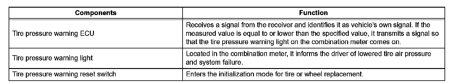 - During initialization, the tire pressure warning valve and transmitter measures the inflation pressure of the tires, and registers the signals that are transmitted into the tire pressure warning ECU at a frequency of once per minute. The initialization process is completed when signals from the all tires (including the full-size spare tire) have been received.