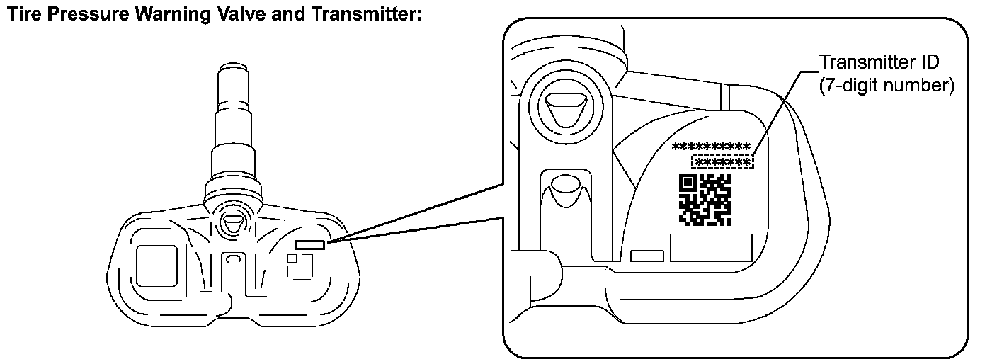 NOTICE: The transmitter ID is written on the tire pressure warning valve and transmitter. It will be unable to be read after installing the tire pressure warning valve and transmitter on the tire and wheel. Therefore, take a note of the transmitter ID before installing the tire pressure warning valve and transmitter.