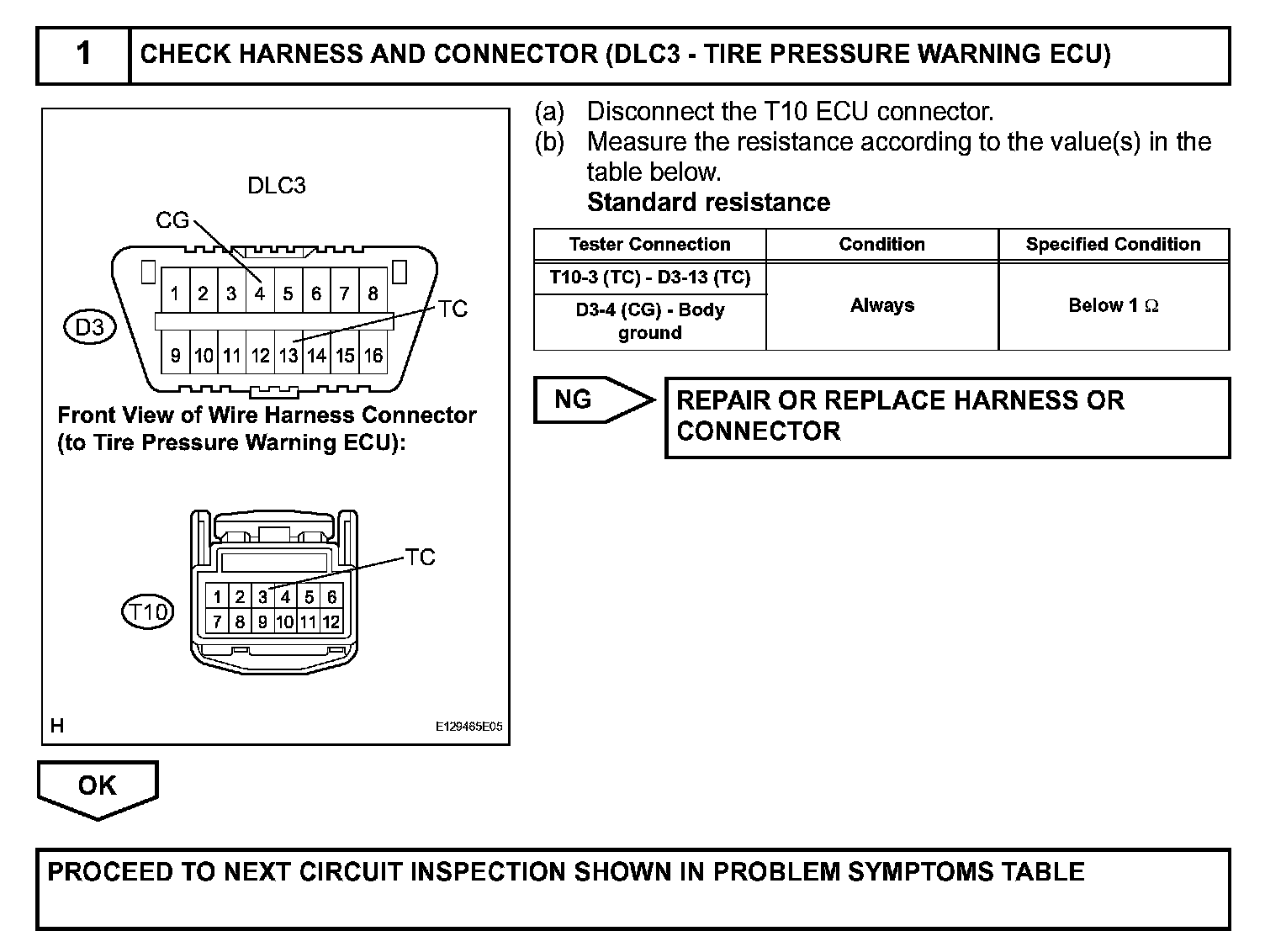 DTC output mode is set by connecting terminals 13 (TC) and 4 (CG) of the DLC3. The DTCs are indicated by blinks of the tire pressure warning light.