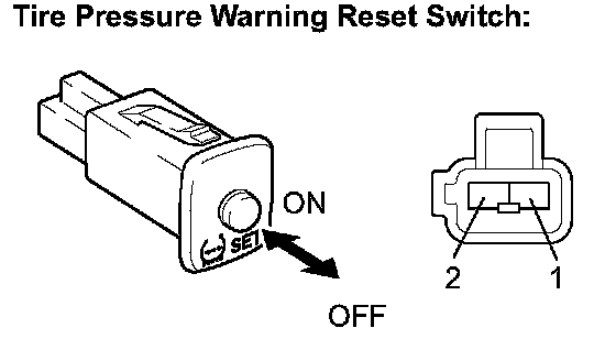 (b) Measure the resistance between terminals 1 and 2 of the tire pressure warning reset switch when the tire pressure warning switch is ON and OFF.