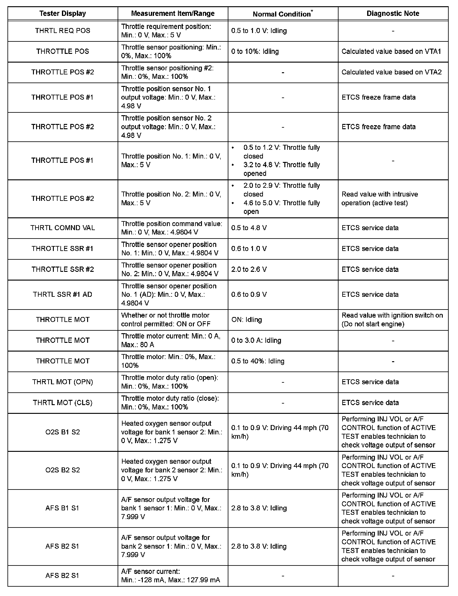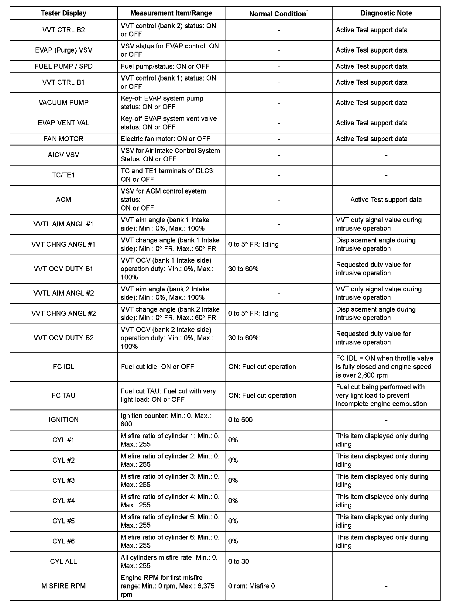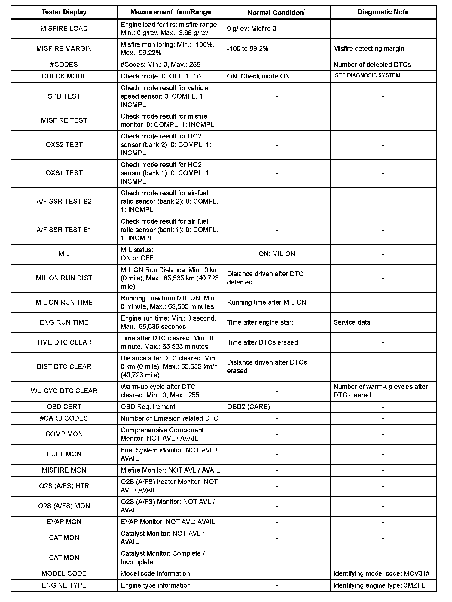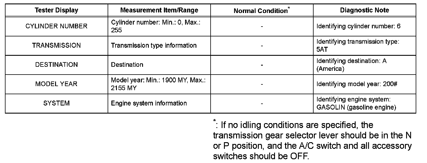 DATA LISTHINT: Reading the DATA LIST displayed on an intelligent tester enables values, including those of the switches, sensors, and actuators, to be checked without removing any parts. Reading the DATA LIST as the first step in troubleshooting is one method to shorten diagnostic time.