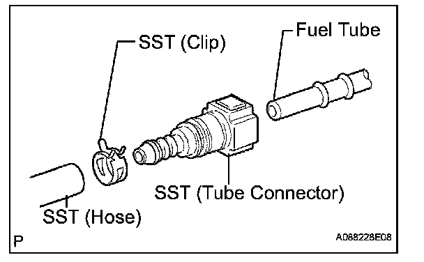 1. Connect SST (fuel tube connector) to SST (hose), then connect them to the fuel pipe (vehicle side).