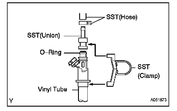 3. Connect SST (adapter and hose) to the injector, and hold the injector and union with SST (clamp).